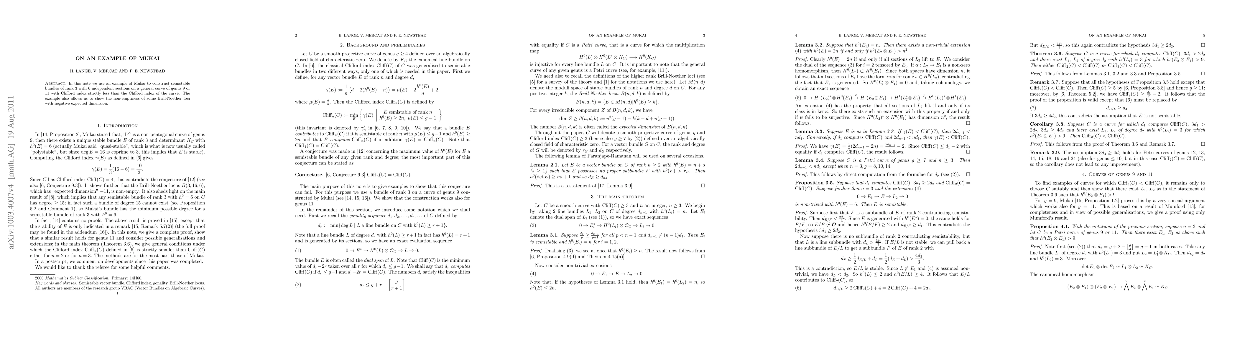 In this note we use an example of Mukai to construct semistable bundles of rank 3 with 6 independent sections on a curve of genus 9 or 11 with Clifford index strictly less than the Clifford index of the curve. The example also allows us to show the non-emptiness of some Brill-Noether loci with negative expected dimension.