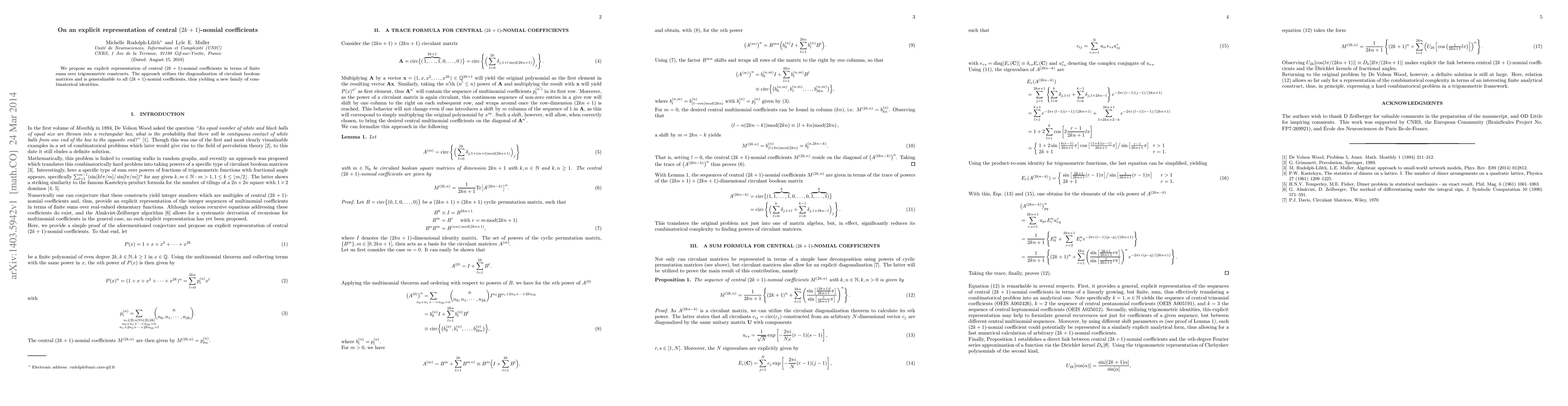 This paper presents an explicit representation of central $(2k+1)$-nomial coefficients using finite sums involving trigonometric constructs, achieved through the diagonalization of circulant boolean matrices, with implications for a new set of combinatorial identities.