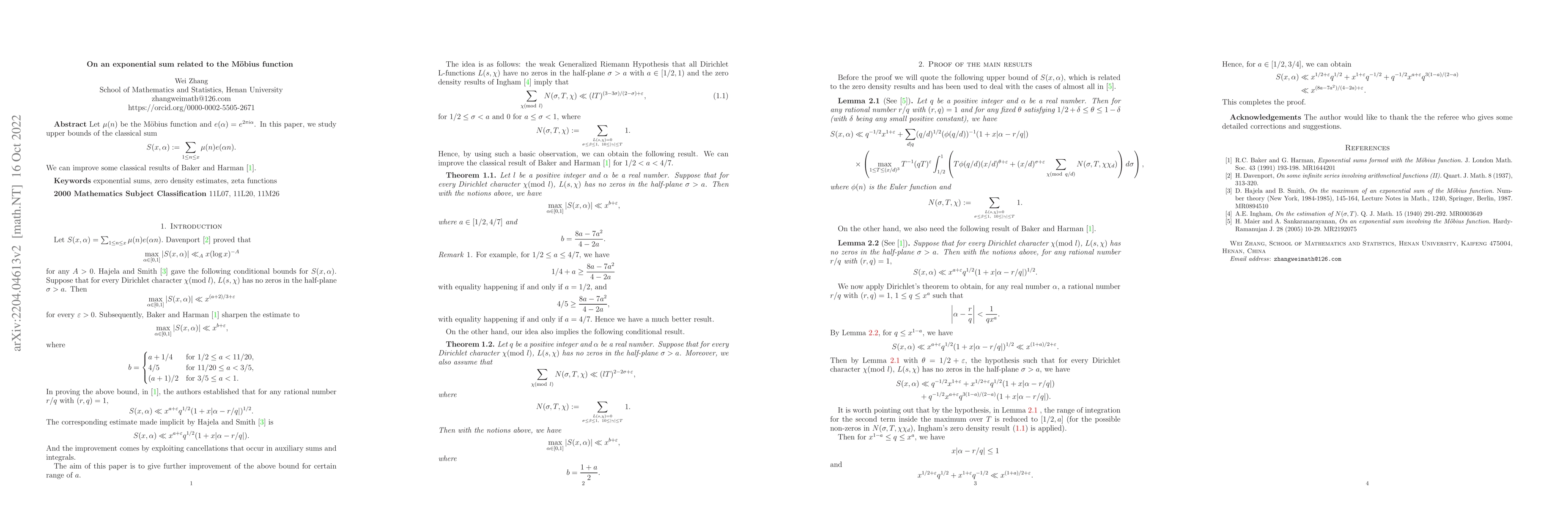 This paper investigates upper bounds for the classical exponential sum $S(x,\alpha) = \sum_{1\leq n\leq x}\mu(n)e(\alpha n)$, where $\mu(n)$ is the M\"obius function and $e(\alpha)=e^{2\pi i\alpha}$. The authors improve upon previous results established by Baker and Harman.