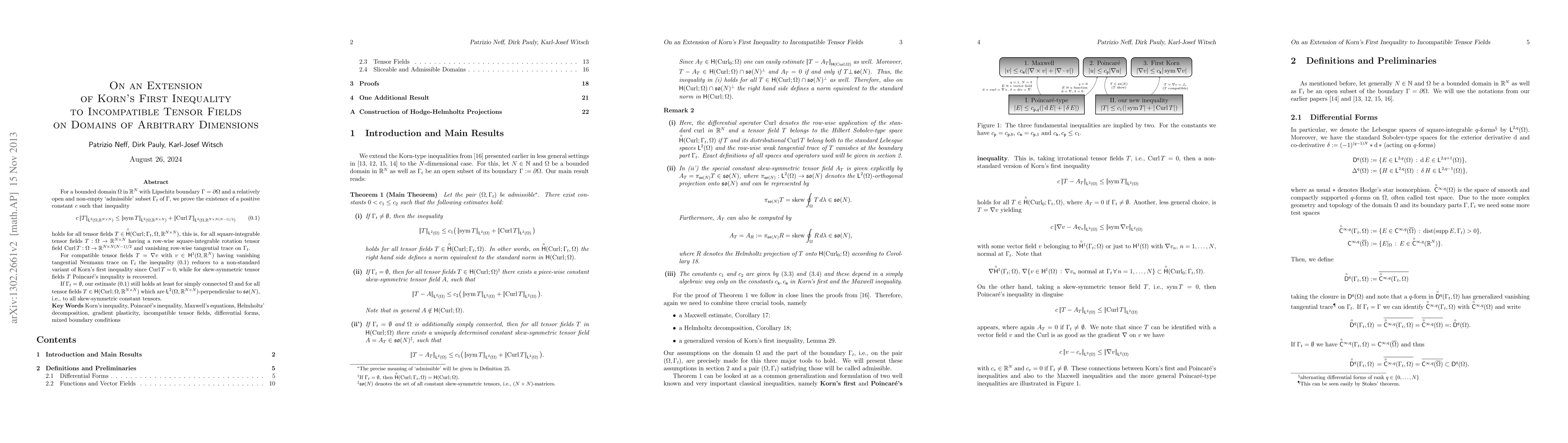 This paper extends Korn's first inequality to incompatible tensor fields in N-dimensional domains with Lipschitz boundaries, providing a generalization that encompasses both Korn's and Poincare's inequalities. The study employs classical Korn's inequality, Helmholtz decompositions, and the Maxwell estimate as key tools.