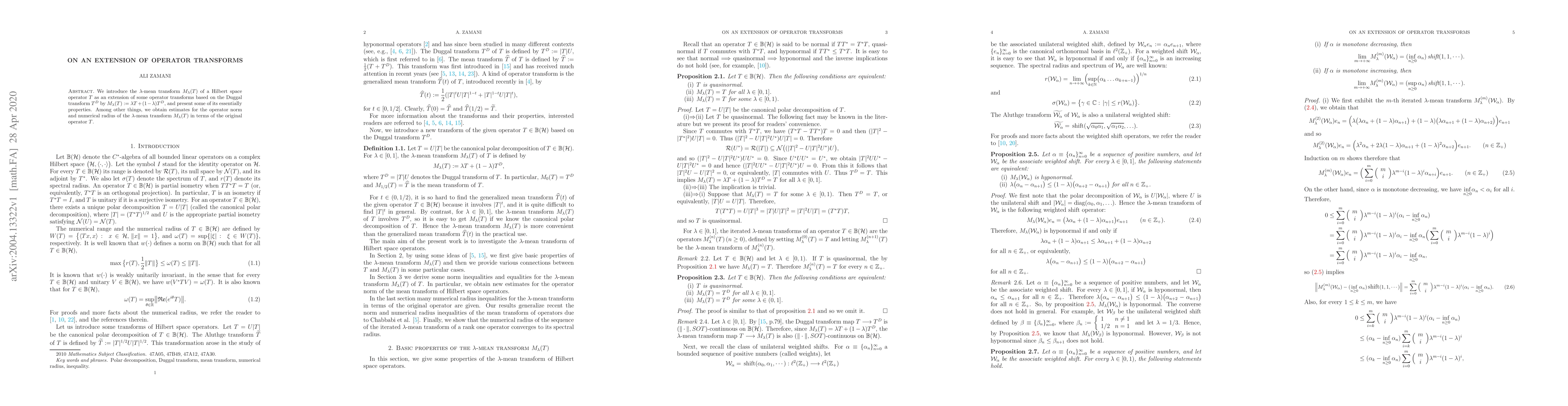 We introduce the $\lambda$-mean transform $M_{\lambda}(T)$ of a Hilbert space operator $T$ as an extension of some operator transforms based on the Duggal transform $T^D$ by $M_{\lambda}(T) := \lambda T + (1-\lambda)T^D$, and present some of its essentially properties. Among other things, we obtain estimates for the operator norm and numerical radius of the $\lambda$-mean transform $M_{\lambda}(T)$ in terms of the original operator $T$.