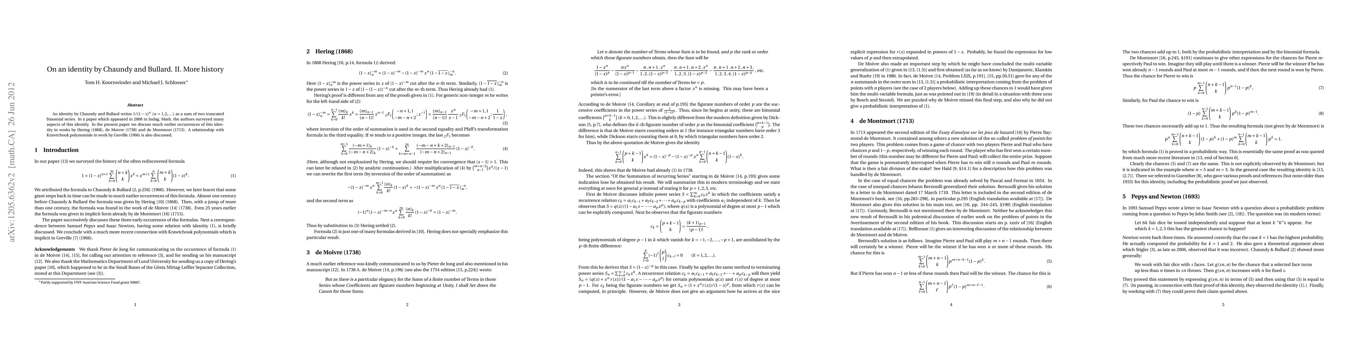 An identity by Chaundy and Bullard writes 1/(1-x)^n (n=1,2,...) as a sum of two truncated binomial series. In a paper which appeared in 2008 in Indag. Math. the authors surveyed many aspects of this identity. In the present paper we discuss much earlier occurrences of this identity in works by Hering (1868), de Moivre (1738) and de Montmort (1713). A relationship with Krawtchouk polynomials in work by Greville (1966) is also discussed.