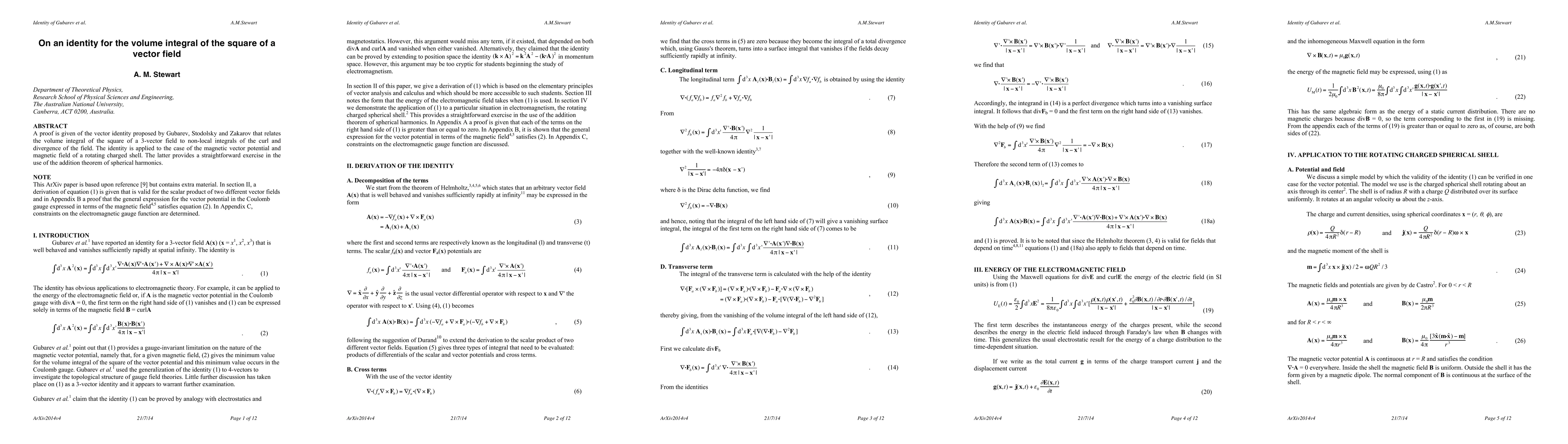 A proof is given of the vector identity proposed by Gubarev, Stodolsky and Zakarov that relates the volume integral of the square of a 3-vector field to non-local integrals of the curl and divergence of the field. The identity is applied to the case of the magnetic vector potential and magnetic field of a rotating charged shell. The latter provides a straightforward exercise in the use of the addition theorem of spherical harmonics.