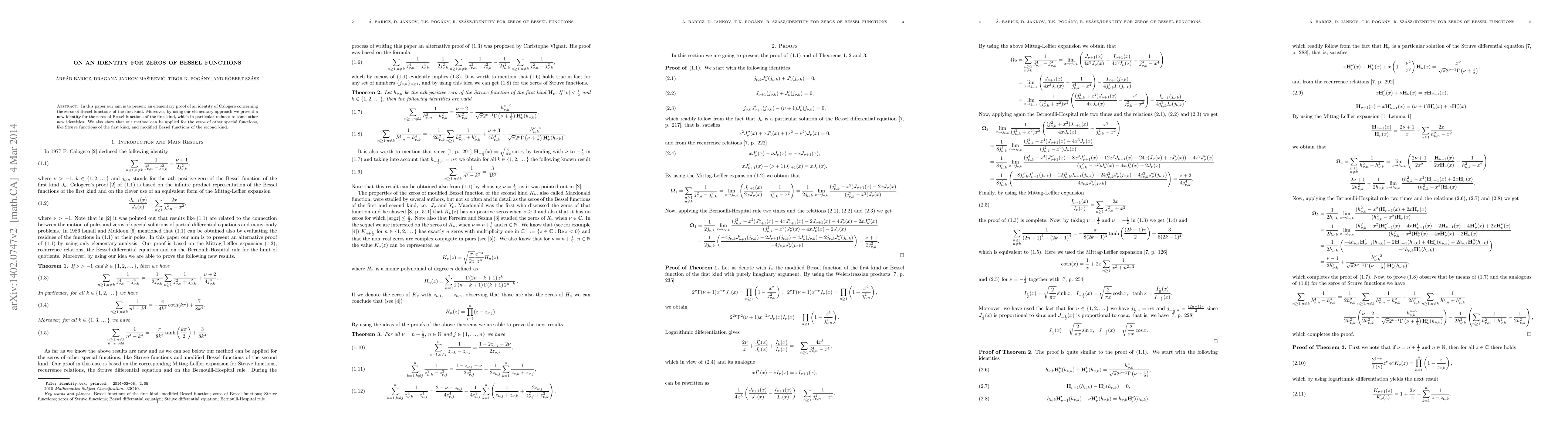 This paper provides an elementary proof for an identity related to the zeros of Bessel functions of the first kind, introduces a new related identity, and demonstrates its applicability to other special functions such as Struve functions and modified Bessel functions.