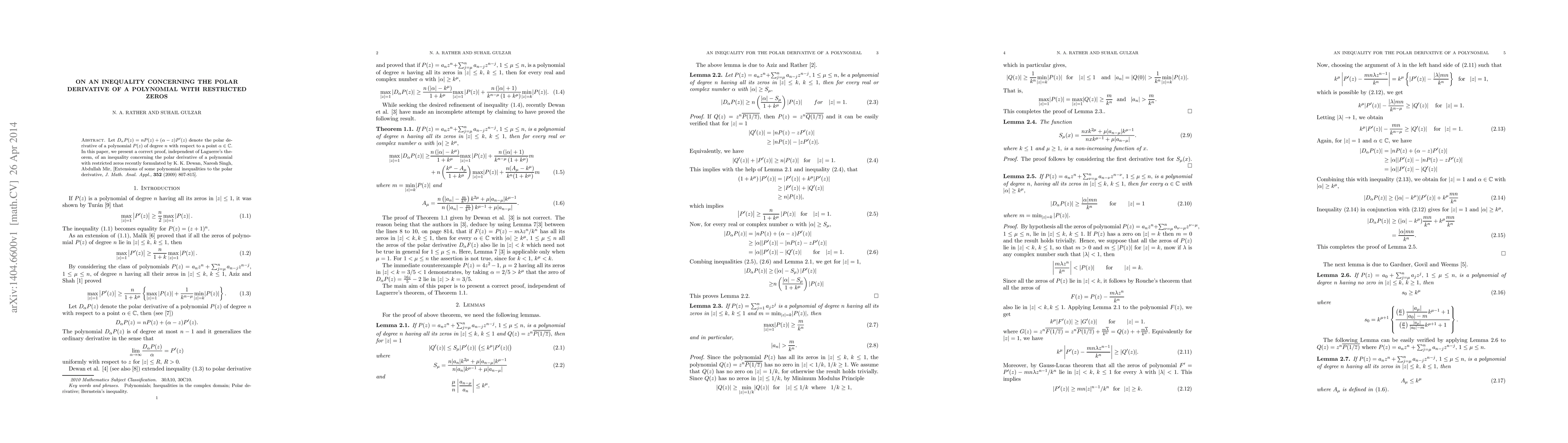 Let $D_\alpha P(z)=nP(z)+(\alpha-z)P^{\prime}(z)$ denote the polar derivative of a polynomial $P(z)$ of degree $n$ with respect to a point $\alpha\in\mathbb{C}.$ In this paper, we present a correct proof, independent of Laguerre's theorem, of an inequality concerning the polar derivative of a polynomial with restricted zeros recently formulated by K. K. Dewan, Naresh Singh, Abdullah Mir, [Extensions of some polynomial inequalities to the polar derivative, \emph{J. Math. Anal. Appl.,} \textbf{352} (2009) 807-815].