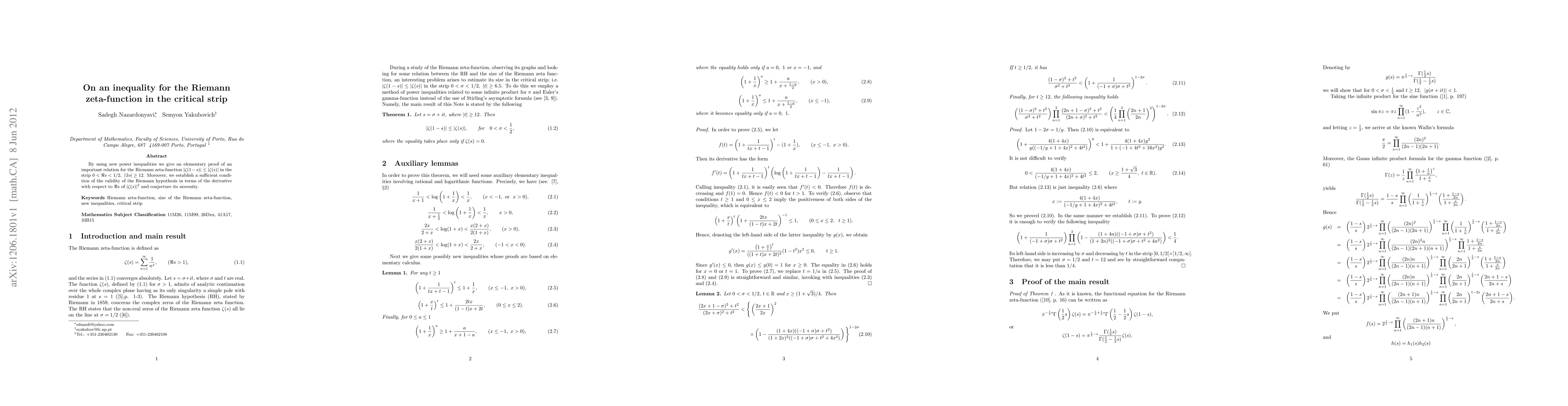By using new power inequalities we give an elementary proof of an important relation for the Riemann zeta-function |\zeta(1-s)| <= |\zeta(s)| in the strip 0< Re s<1/2,\ |\Im s| >= 12. Moreover, we establish a sufficient condition of the validity of the Riemann hypothesis in terms of the derivative with respect to Re s of |\zeta(s)|^2 and conjecture its necessity.