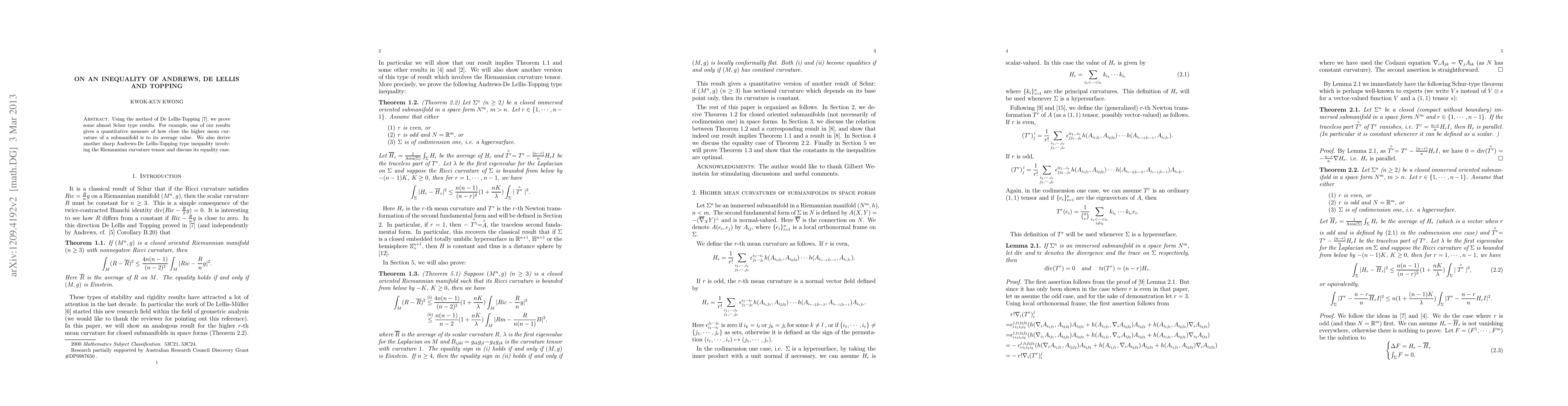 Using the method of De Lellis-Topping, we prove some almost Schur type results. For example, one of our results gives a quantitative measure of how close the higher mean curvature of a submanifold is to its average value. We also derive another sharp Andrews-De Lellis-Topping type inequality involving the Riemannian curvature tensor and discuss its equality case.
