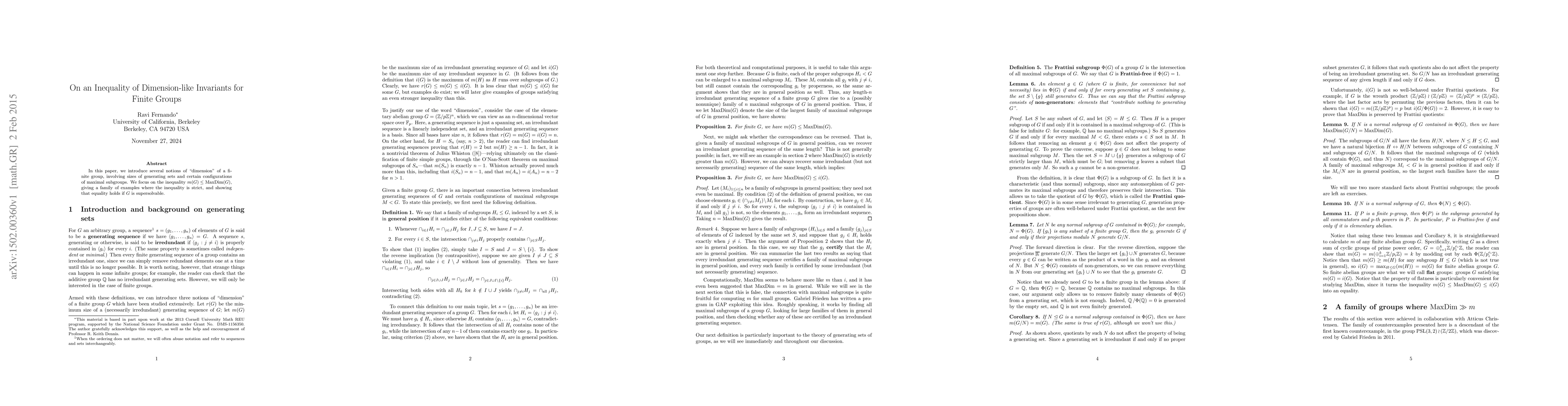 In this paper, we introduce several notions of "dimension" of a finite group, involving sizes of generating sets and certain configurations of maximal subgroups. We focus on the inequality $m(G) \leq \mathrm{MaxDim}(G)$, giving a family of examples where the inequality is strict, and showing that equality holds if $G$ is supersolvable.