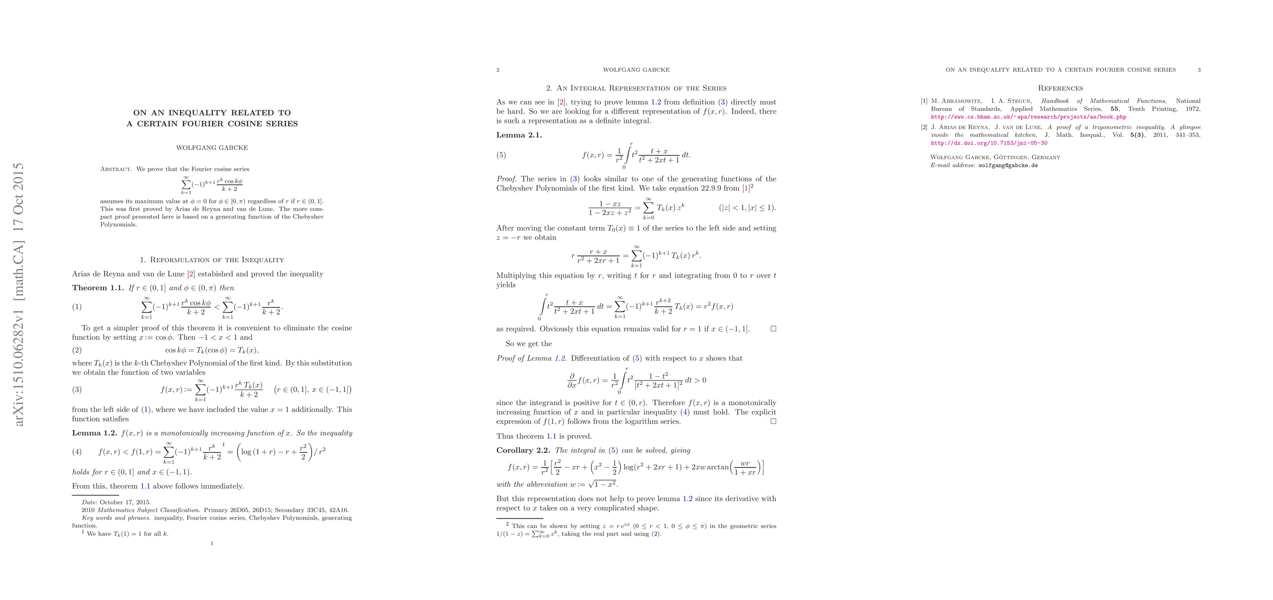 We prove that the Fourier cosine series $\sum_{k=1}^{\infty}(-1)^{k+1}\frac{r^k\cos{k\phi}}{k+2}$ assumes its maximum value at $\phi = 0$ for $\phi \in [0, \pi)$ regardless of $r$ if $r \in (0, 1]$. This was first proved by Arias de Reyna and van de Lune. The more compact proof presented here is based on a generating function of the Chebyshev Polynomials.