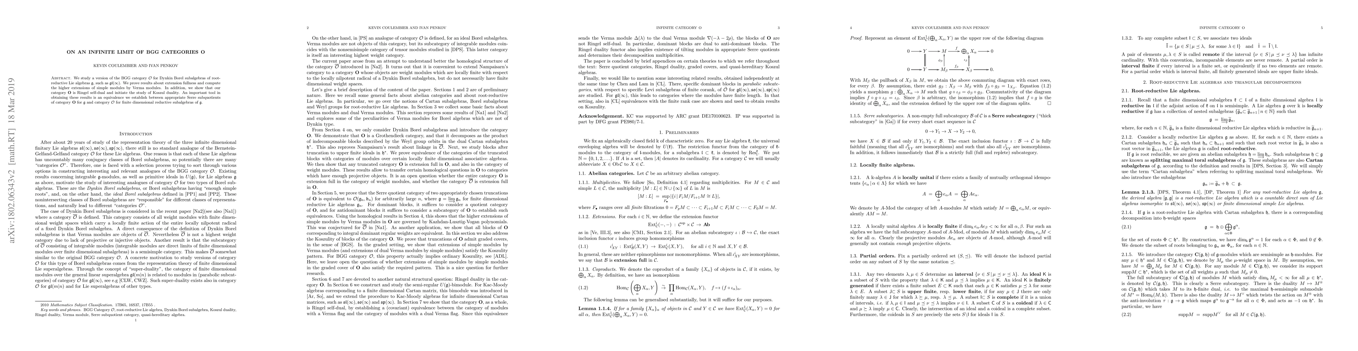 This paper studies an infinite limit of BGG categories O for Dynkin Borel subalgebras of root-reductive Lie algebras, proving results about extension fullness and Koszul duality, while establishing an equivalence between category O for g and finite dimensional reductive subalgebras of g.