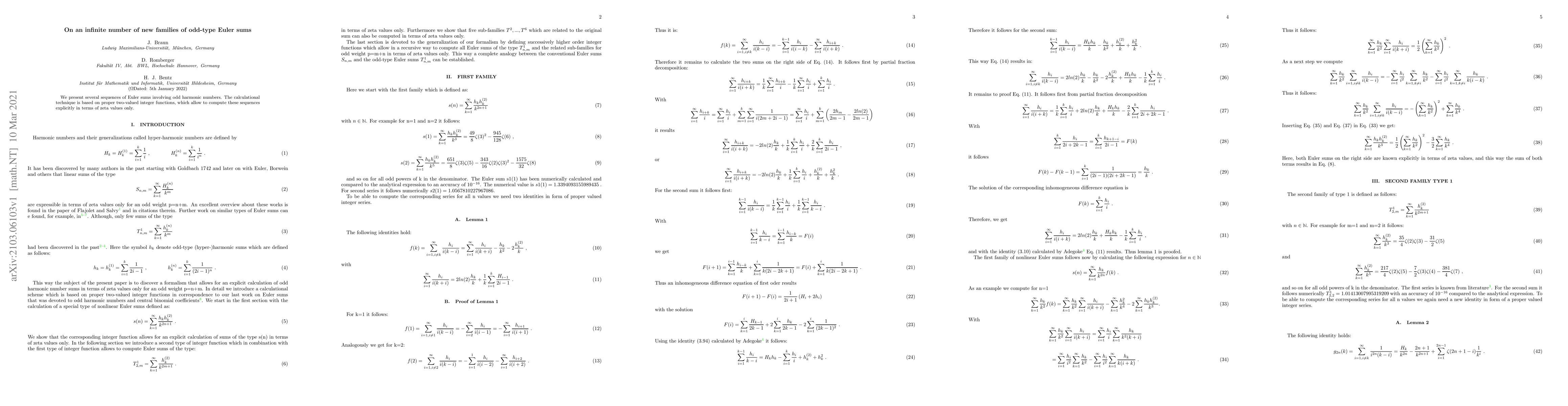 This paper introduces new families of odd-type Euler sums using sequences involving odd harmonic numbers, employing a calculational technique based on two-valued integer functions to express them explicitly in terms of zeta values.
