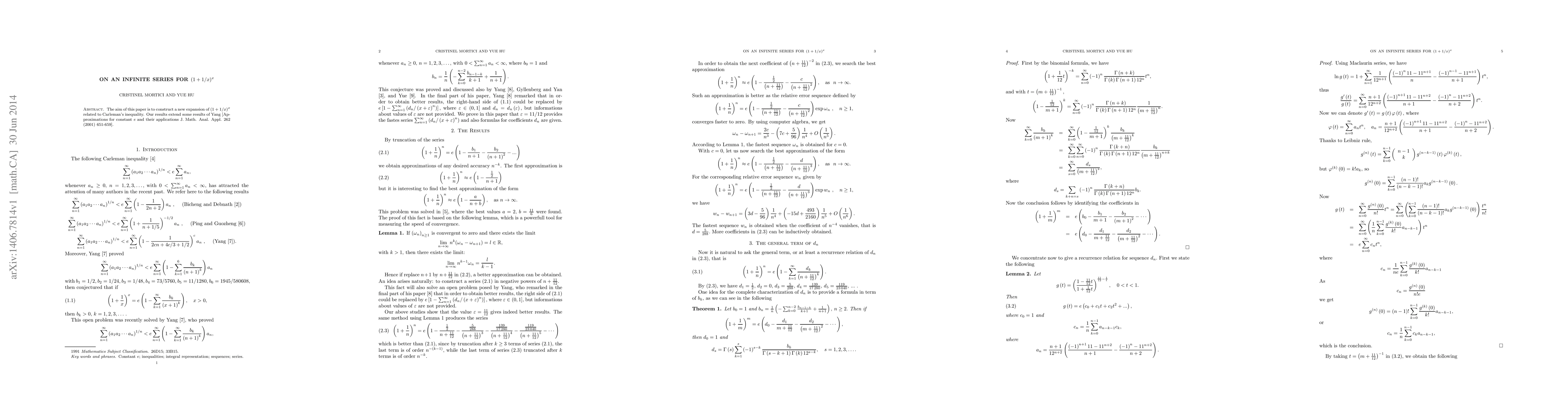 A new expansion method for $(1+1/x)^x$ is developed, extending previous results related to Carleman's inequality. This approach can lead to more accurate approximations of the expression.
