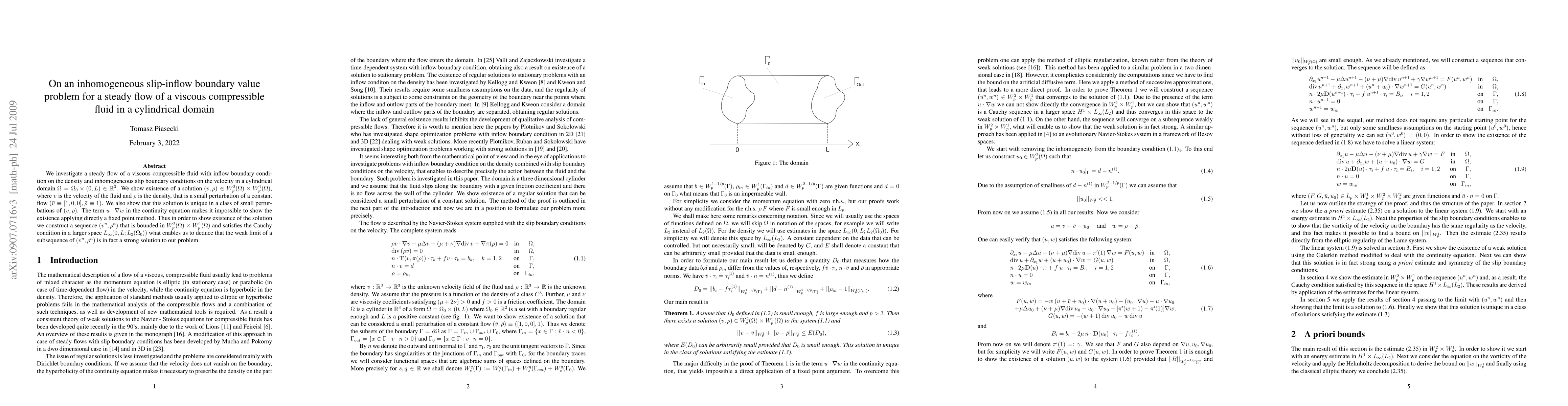 We investigate a steady flow of a viscous compressible fluid with inflow boundary condition on the density and inhomogeneous slip boundary conditions on the velocity in a cylindrical domain $\Omega = \Omega_0 \times (0,L) \in \mathbb{R}^3$. We show existence of a solution $(v,\rho) \in W^2_p(\Omega) \times W^1_p(\Omega)$, where $v$ is the velocity of the fluid and $\rho$ is the density, that is a small perturbation of a constant flow $(\bar v \equiv [1,0,0], \bar \rho \equiv 1)$. We also show that this solution is unique in a class of small perturbations of $(\bar v,\bar \rho)$. The term $u \cdot \nabla w$ in the continuity equation makes it impossible to show the existence applying directly a fixed point method. Thus in order to show existence of the solution we construct a sequence $(v^n,\rho^n)$ that is bounded in $W^2_p(\Omega) \times W^1_p(\Omega)$ and satisfies the Cauchy condition in a larger space $L_{\infty}(0,L;L_2(\Omega_0))$ what enables us to deduce that the weak limit of a subsequence of $(v^n,\rho^n)$ is in fact a strong solution to our problem.