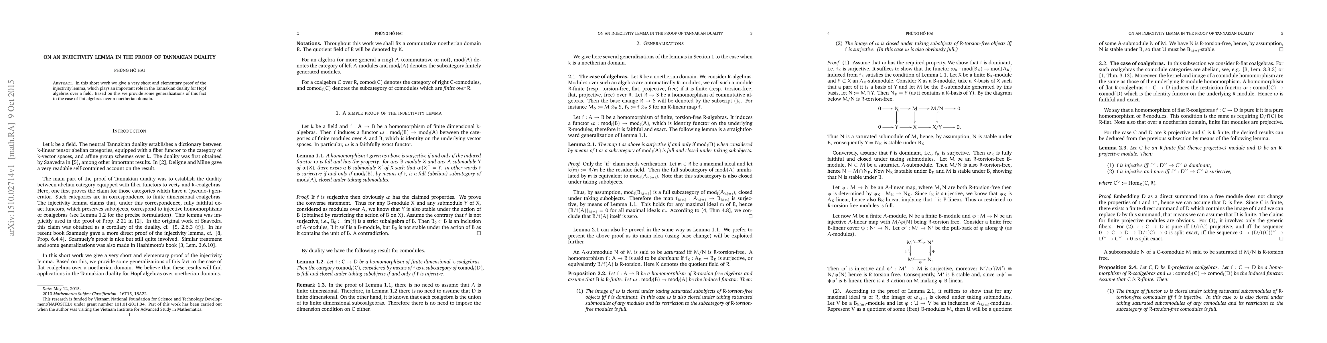 In this short work we give a very short and elementary proof of the injectivity lemma, which plays an important role in the Tannakian duality for Hopf algebras over a field. Based on this we provide some generalizations of this fact to the case of flat algebras over a noetherian domain.