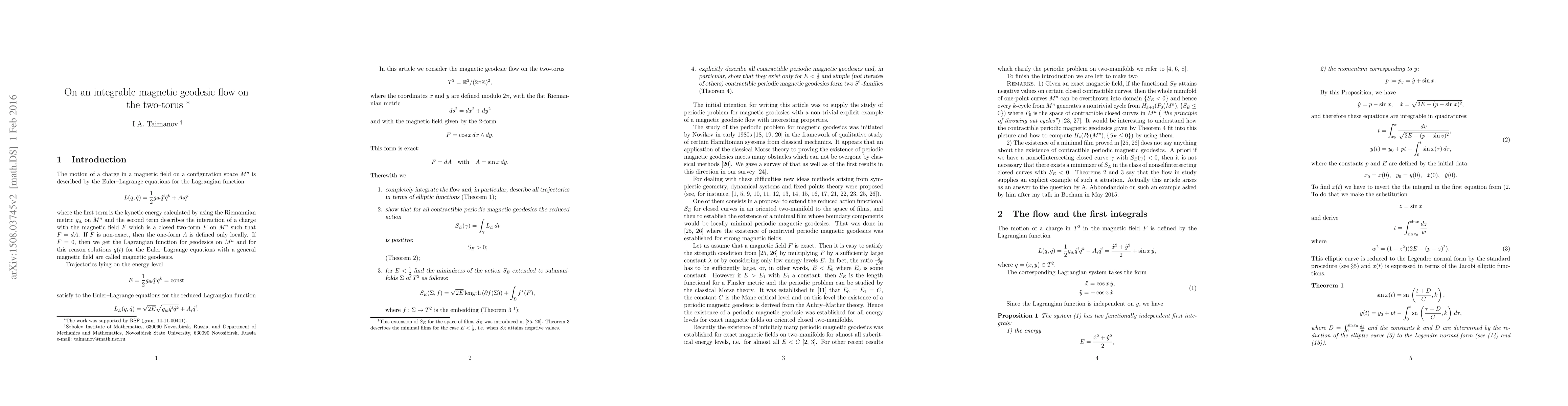 This paper fully integrates the magnetic geodesic flow on a flat two-torus with a specific magnetic field, revealing that no contractible periodic magnetic geodesics exist for energies $E \geq 1/2$. For $E < 1/2$, two $S^1$-families of simple periodic magnetic geodesics are identified, with positive action functionals, indicating no periodic geodesics with negative action.