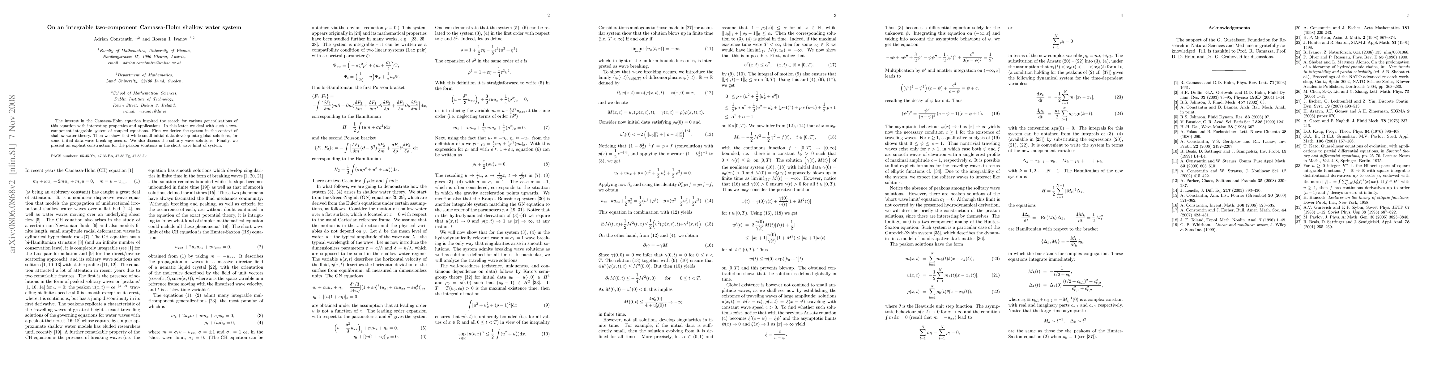 This paper explores a two-component integrable system derived from the Camassa-Holm equation in shallow water theory, demonstrating global solutions for small initial data and wave breaking phenomena. It also investigates solitary and peakon solutions in the short wave limit.