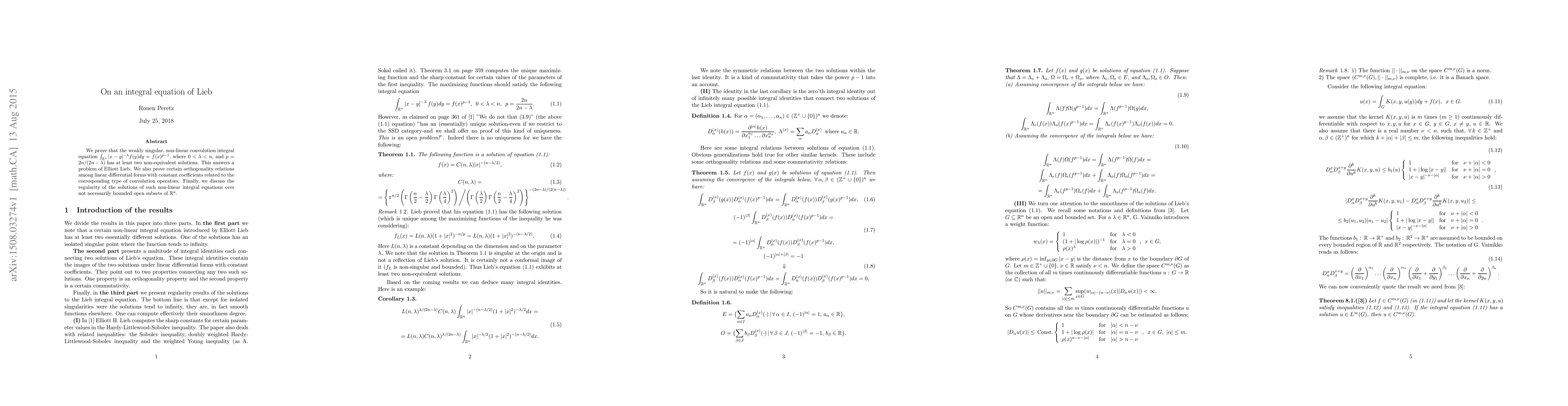 The paper proves the existence of at least two non-equivalent solutions for a specific non-linear integral equation, addressing a problem posed by Elliott Lieb. It also establishes orthogonality relations for related linear differential forms and discusses the regularity of solutions over non-bounded open subsets in R^n.