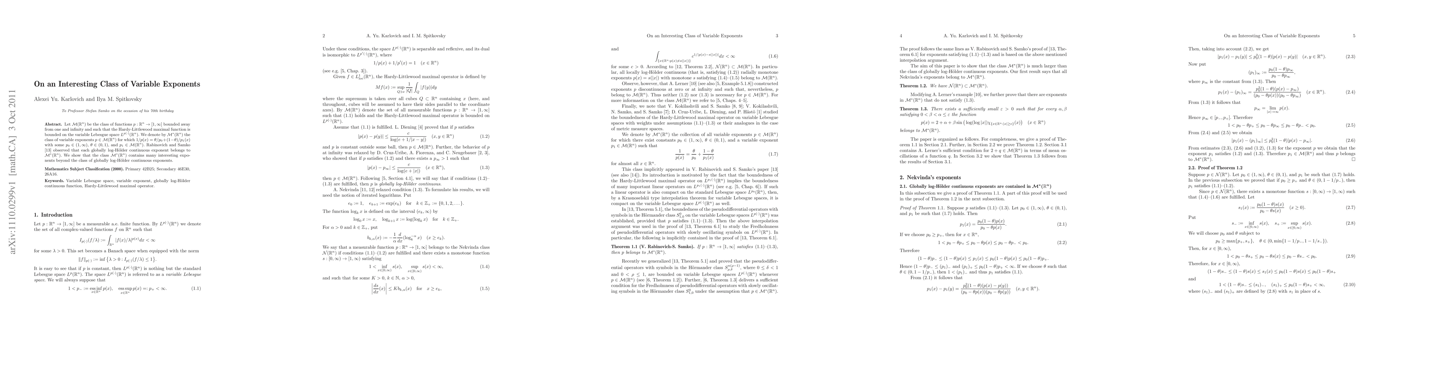 Let $\mathcal{M}(\mathbb{R}^n)$ be the class of functions $p:\mathbb{R}^n\to[1,\infty]$ bounded away from one and infinity and such that the Hardy-Littlewood maximal function is bounded on the variable Lebesgue space $L^{p(\cdot)}(\mathbb{R}^n)$. We denote by $\mathcal{M}^*(\mathbb{R}^n)$ the class of variable exponents $p\in\mathcal{M}(\mathbb{R}^n)$ for which $1/p(x)=\theta/p_0+(1-\theta)/p_1(x)$ with some $p_0\in(1,\infty)$, $\theta\in(0,1)$, and $p_1\in\mathcal{M}(\mathbb{R}^n)$. Rabinovich and Samko \cite{RS08} observed that each globally log-H\"older continuous exponent belongs to $\mathcal{M}^*(\mathbb{R}^n)$. We show that the class $\mathcal{M}^*(\mathbb{R}^n)$ contains many interesting exponents beyond the class of globally log-H\"older continuous exponents.