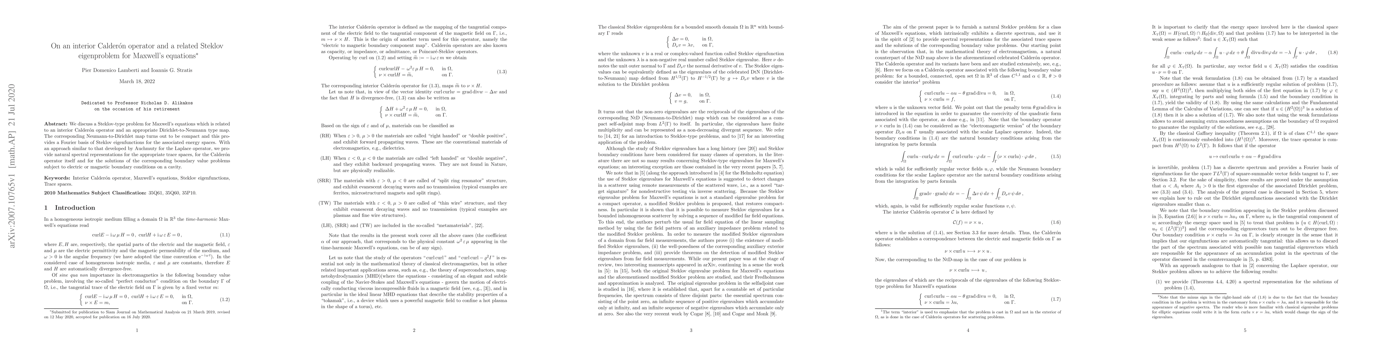 We discuss a Steklov-type problem for Maxwell's equations which is related to an interior Calder\'{o}n operator and an appropriate Dirichlet-to-Neumann type map. The corresponding Neumann-to-Dirichlet map turns out to be compact and this provides a Fourier basis of Steklov eigenfunctions for the associated energy spaces. With an approach similar to that developed by Auchmuty for the Laplace operator, we provide natural spectral representations for the appropriate trace spaces, for the Calder\'{o}n operator itself and for the solutions of the corresponding boundary value problems subject to electric or magnetic boundary conditions on a cavity.