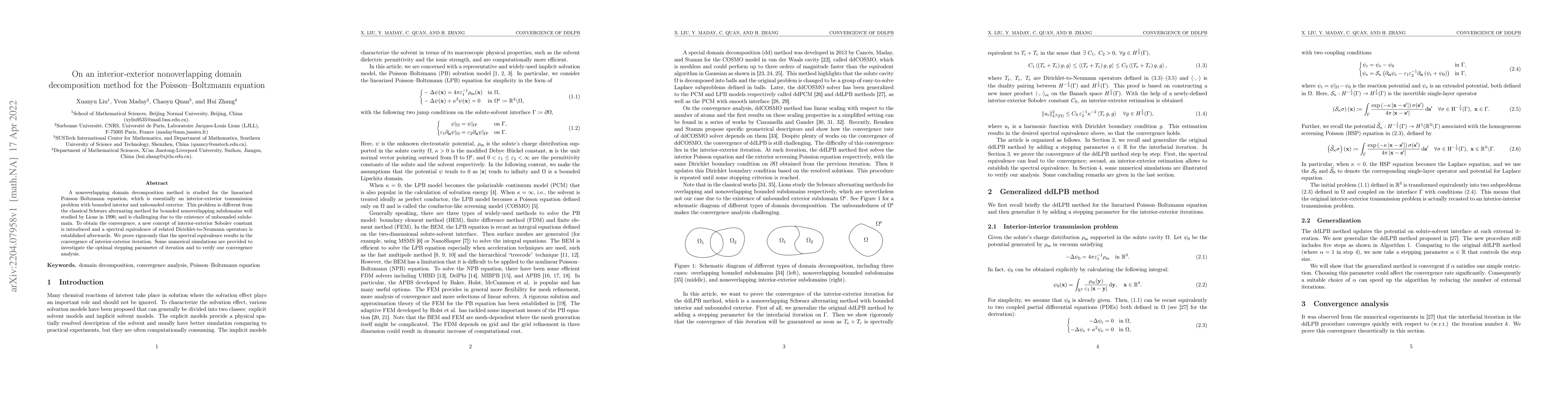 This paper introduces a nonoverlapping domain decomposition method for solving the linearized Poisson-Boltzmann equation, addressing the unique challenges of an unbounded exterior. The authors establish spectral equivalence of related operators and define an interior-exterior Sobolev constant to ensure convergence, supported by numerical simulations.