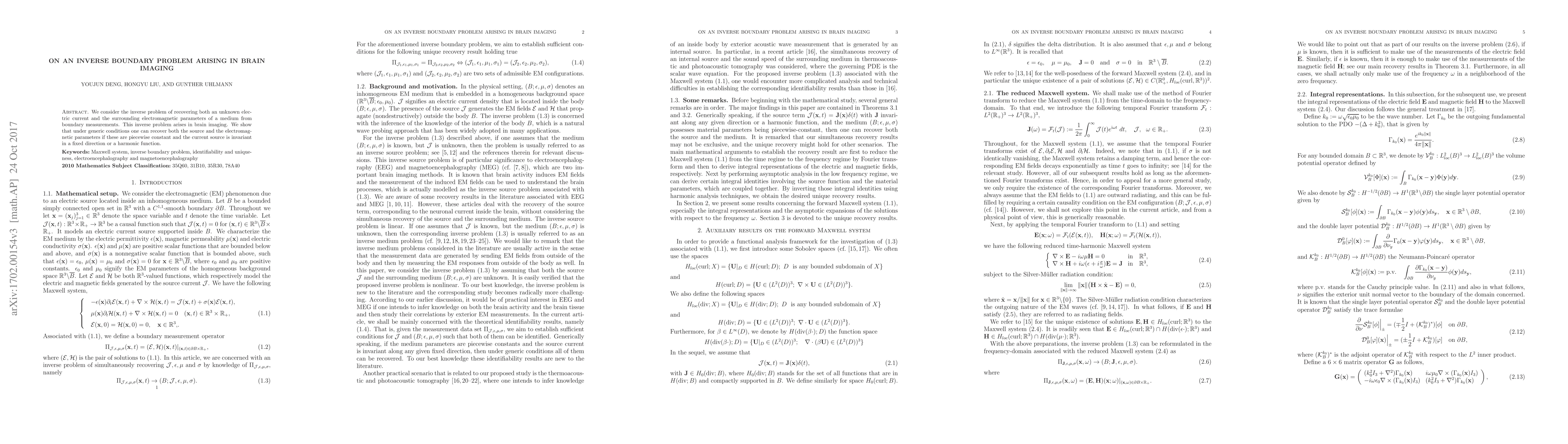 This paper addresses an inverse boundary problem in brain imaging, focusing on recovering an unknown electric current and electromagnetic parameters from boundary measurements. The authors demonstrate that under specific conditions, such as piecewise constant parameters and invariant current sources, both the source and parameters can be accurately reconstructed.