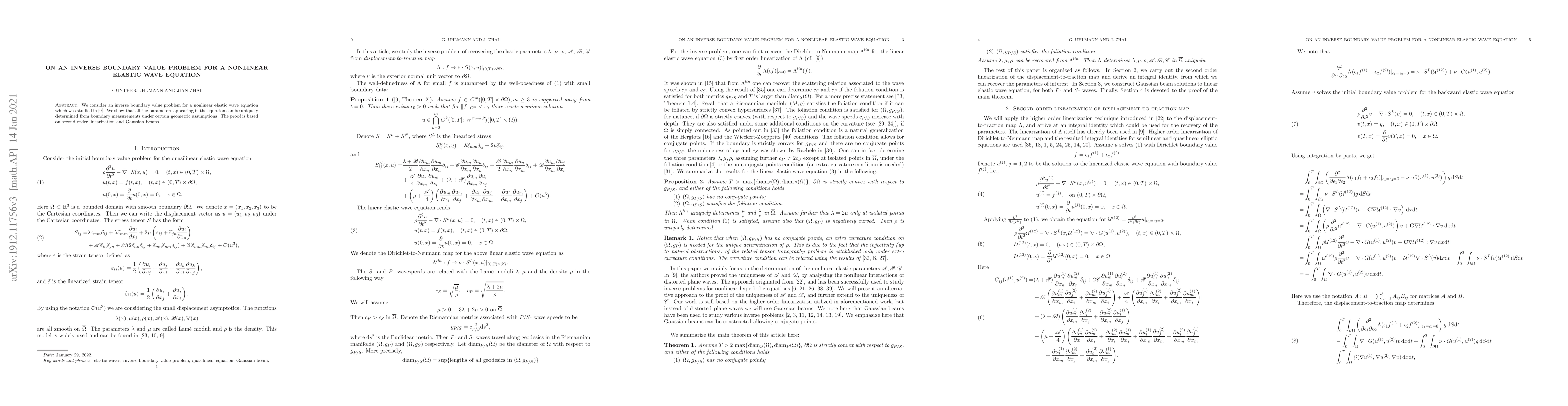 Summary: This paper addresses an inverse boundary value problem for a nonlinear elastic wave equation, demonstrating that parameters can be uniquely determined from boundary measurements using second order linearization and Gaussian beams under specific geometric assumptions.