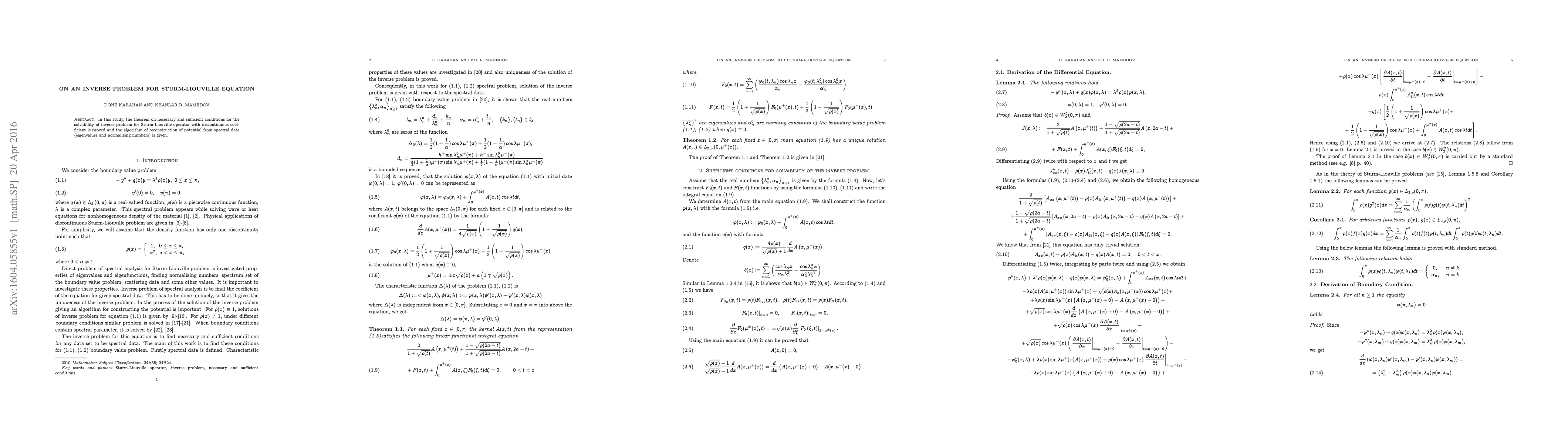This study proves a theorem for the solvability of inverse problems for Sturm-Liouville operators with discontinuous coefficients, providing an algorithm to reconstruct potential from spectral data.
