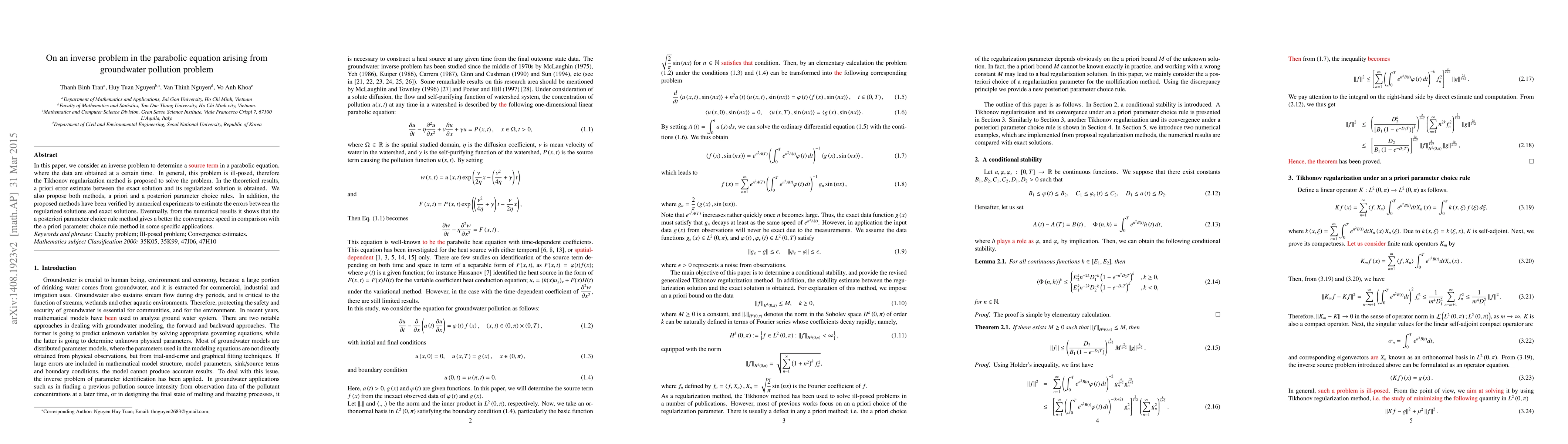 In this paper, we consider an inverse problem to determine a source term in a parabolic equation, where the data are obtained at a certain time. In general, this problem is ill-posed, therefore the Tikhonov regularization method is proposed to solve the problem. In the theoretical results, a priori error estimate between the exact solution and its regularized solutions is obtained. We also propose both methods, a priori and a posteriori parameter choice rules. In addition, the proposed methods have been verified by numerical experiments to estimate the errors between the regularized solutions and exact solutions. Eventually, from the numerical results it shows that the a posteriori parameter choice rule method gives a better the convergence speed in comparison with the a priori parameter choice rule method in some specific applications.