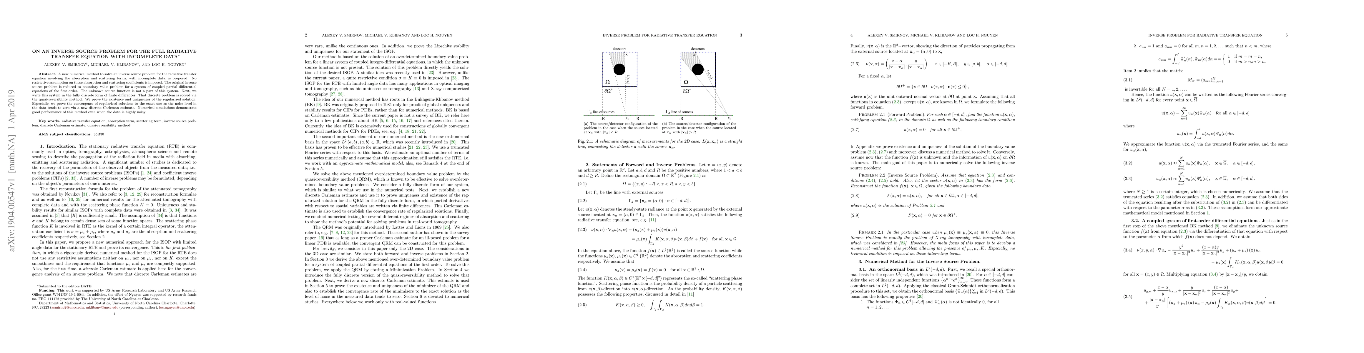 A new numerical method to solve an inverse source problem for the radiative transfer equation involving the absorption and scattering terms, with incomplete data, is proposed. No restrictive assumption on those absorption and scattering coefficients is imposed. The original inverse source problem is reduced to boundary value problem for a system of coupled partial differential equations of the first order. The unknown source function is not a part of this system. Next, we write this system in the fully discrete form of finite differences. That discrete problem is solved via the quasi-reversibility method. We prove the existence and uniqueness of the regularized solution. Especially, we prove the convergence of regularized solutions to the exact one as the noise level in the data tends to zero via a new discrete Carleman estimate. Numerical simulations demonstrate good performance of this method even when the data is highly noisy.