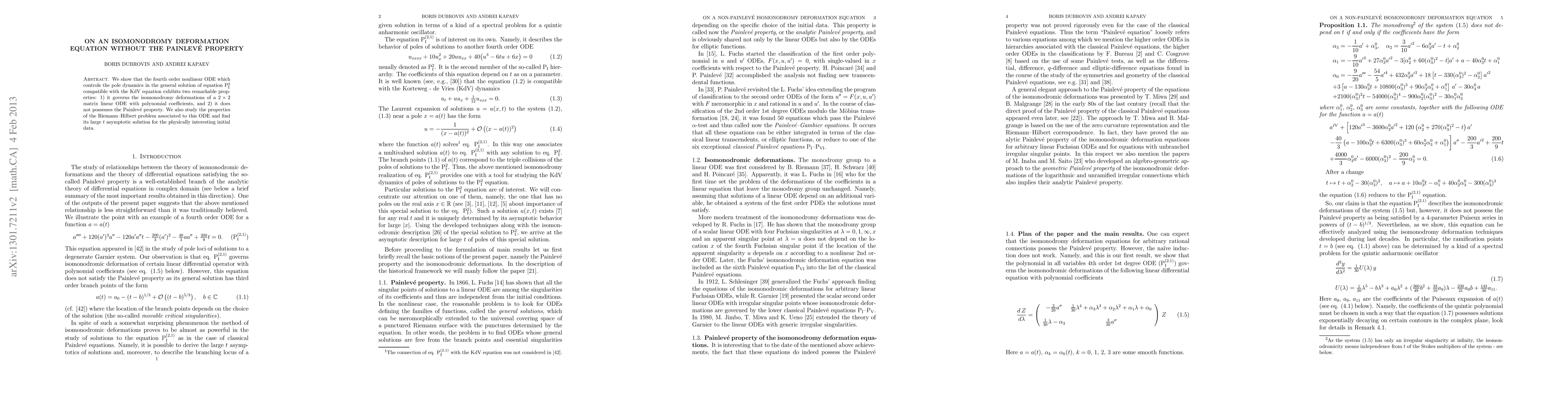This paper demonstrates that a specific fourth-order nonlinear ODE, related to the KdV equation, governs isomonodromy deformations of a $2\times2$ matrix linear ODE with polynomial coefficients. Surprisingly, it lacks the Painlevé property. The study also explores the associated Riemann-Hilbert problem and derives its large $t$ asymptotic solution for relevant initial data.