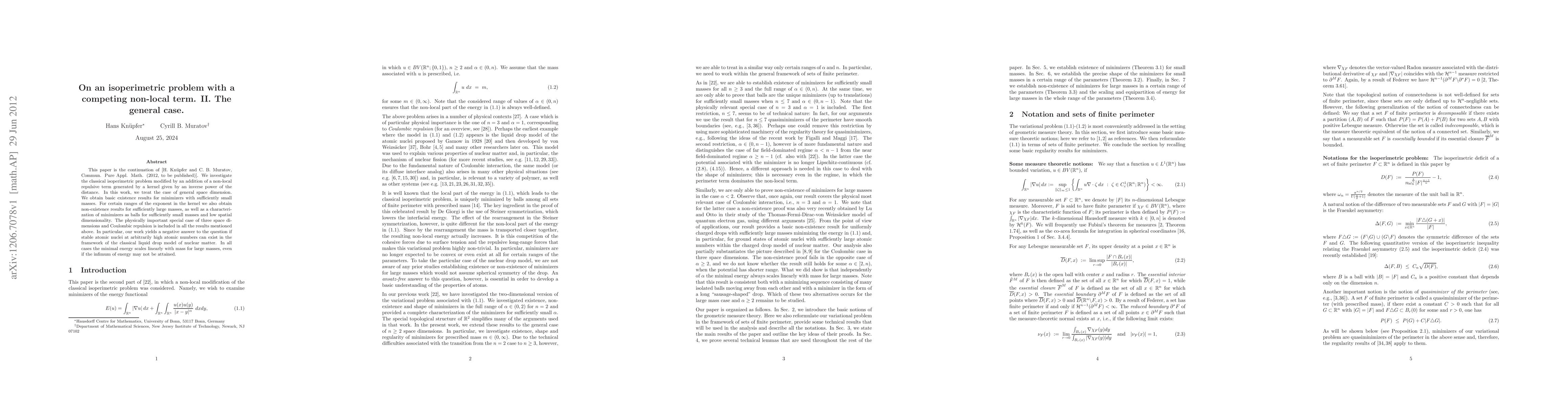 This paper extends the study of a modified isoperimetric problem with a non-local repulsive term, focusing on general space dimensions. It establishes existence and non-existence results for minimizers, showing that stable atomic nuclei cannot exist at high atomic numbers in the classical liquid drop model.