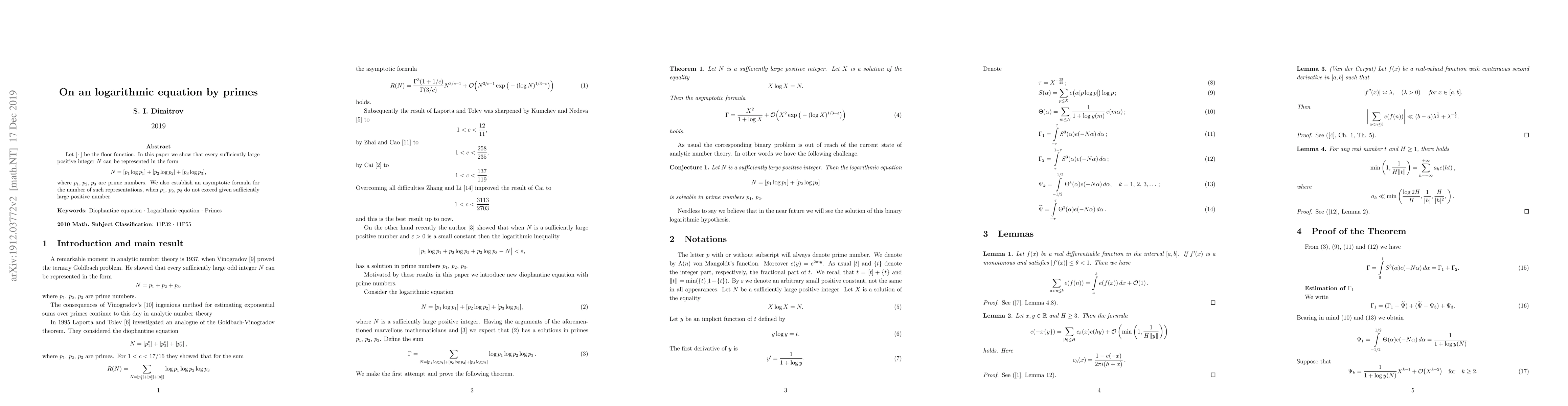 Let $[\, \cdot\,]$ be the floor function. In this paper we show that every sufficiently large positive integer $N$ can be represented in the form \begin{equation*} N=[p_1\log p_1]+[p_2\log p_2]+[p_3\log p_3], \end{equation*} where $p_1,\, p_2,\, p_3$ are prime numbers. We also establish an asymptotic formula for the number of such representations, when $p_1,\, p_2,\, p_3$ do not exceed given sufficiently large positive number.