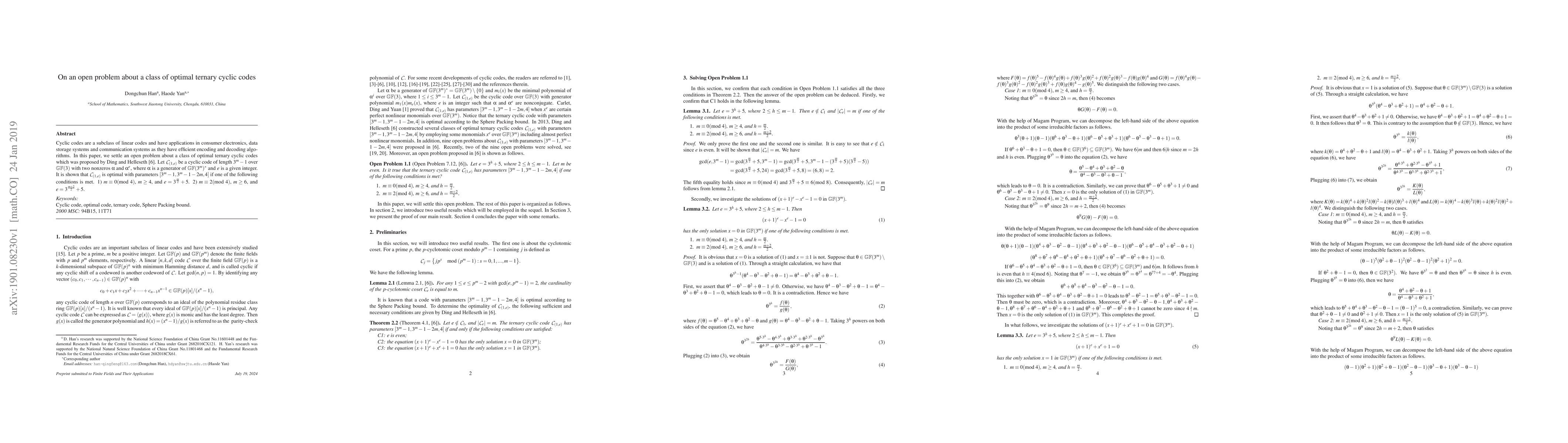 Cyclic codes are a subclass of linear codes and have applications in consumer electronics, data storage systems and communication systems as they have efficient encoding and decoding algorithms. In this paper, we settle an open problem about a class of optimal ternary cyclic codes which was proposed by Ding and Helleseth. Let $C_{(1,e)}$ be a cyclic code of length $3^m-1$ over GF(3) with two nonzeros $\alpha$ and $\alpha^e$, where $\alpha$ is a generator of $GF(3^m)^*$ and e is a given integer. It is shown that $C_{(1,e)}$ is optimal with parameters $[3^m-1,3^m-1-2m,4]$ if one of the following conditions is met. 1) $m\equiv0(\mathrm{mod}~ 4)$, $m\geq 4$, and $e=3^\frac{m}{2}+5$. 2) $m\equiv2(\mathrm{mod}~ 4)$, $m\geq 6$, and $e=3^\frac{m+2}{2}+5$.