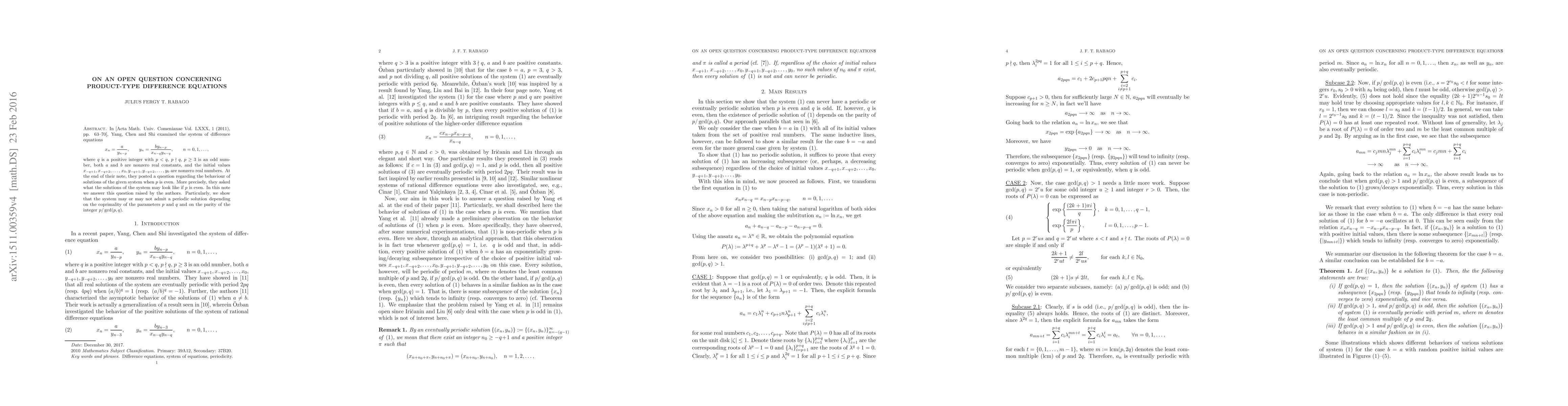 In [Acta Math. Univ. Comenianae Vol. LXXX, 1 (2011), pp. 63--70], Yang, Chen and Shi examined the system of difference equations \[ x_n=\frac{a}{y_{n-p}},\qquad y_n=\frac{by_{n-p}}{x_{n-q}y_{n-q}},\qquad n=0,1,\ldots, \] where $q$ is a positive integer with $p < q$, $p \nmid q$, $p \geq 3$ is an odd number, both $a$ and $b$ are nonzero real constants, and the initial values $x_{-q+1},x_{-q+2},\ldots,$ $x_0,y_{-q+1},y_{-q+2},\ldots,y_0$ are nonzero real numbers. At the end of their note, they posted a question regarding the behaviour of solutions of the given system when $p$ is even. More precisely, they asked what the solutions of the system may look like if $p$ is even. In this note we answer this question raised by the authors. Particularly, we show that the system may or may not admit a periodic solution depending on the coprimality of the parameters $p$ and $q$ and on the parity of the integer $p/\gcd(p,q)$.