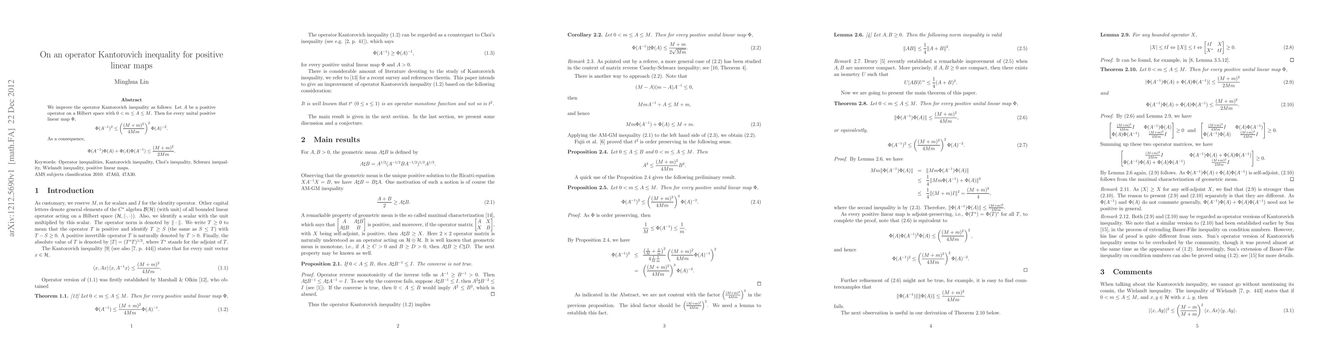We improve the operator Kantorovich inequality as follows: Let $A$ be a