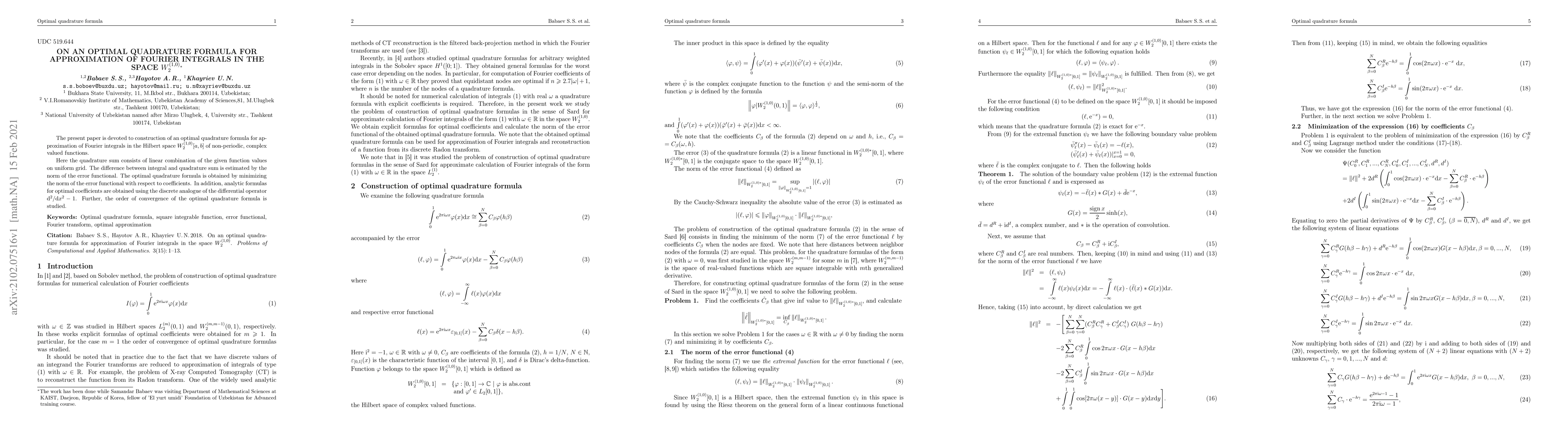 This paper constructs an optimal quadrature formula for approximating Fourier integrals in the Hilbert space $W_2^{(1,0)}$, minimizing the error norm through linear combinations of function values on a uniform grid. Analytic expressions for optimal coefficients are derived using a discrete differential operator, and the convergence rate of the quadrature formula is analyzed.