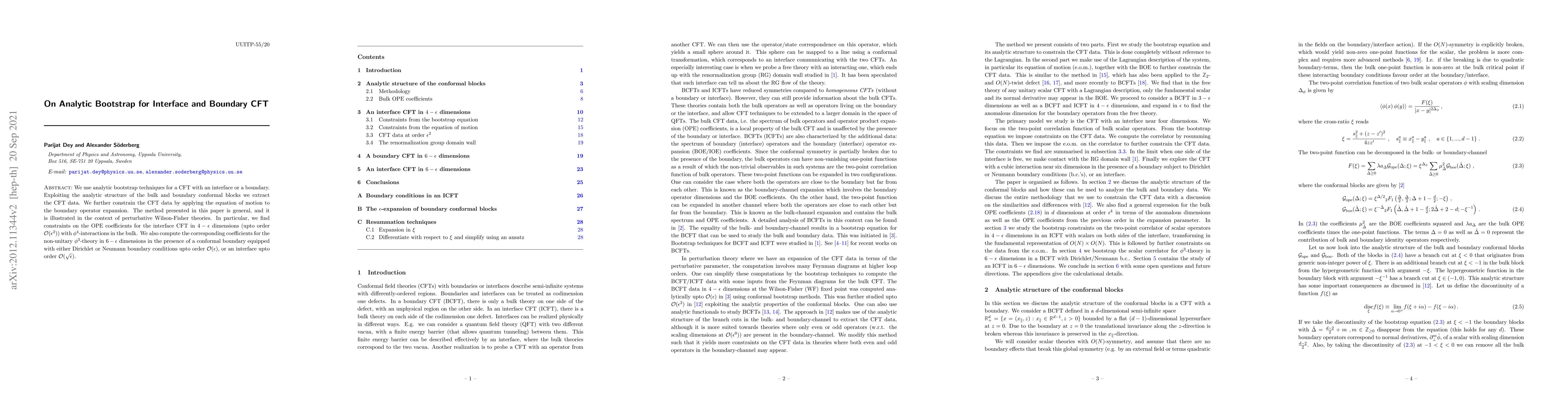 This paper employs analytic bootstrap techniques to extract and constrain CFT data for systems with interfaces or boundaries, specifically focusing on perturbative Wilson-Fisher theories. It provides constraints on OPE coefficients for conformal interface CFT in $4 - \epsilon$ dimensions and non-unitary $\phi^3$-theory in $6 - \epsilon$ dimensions.