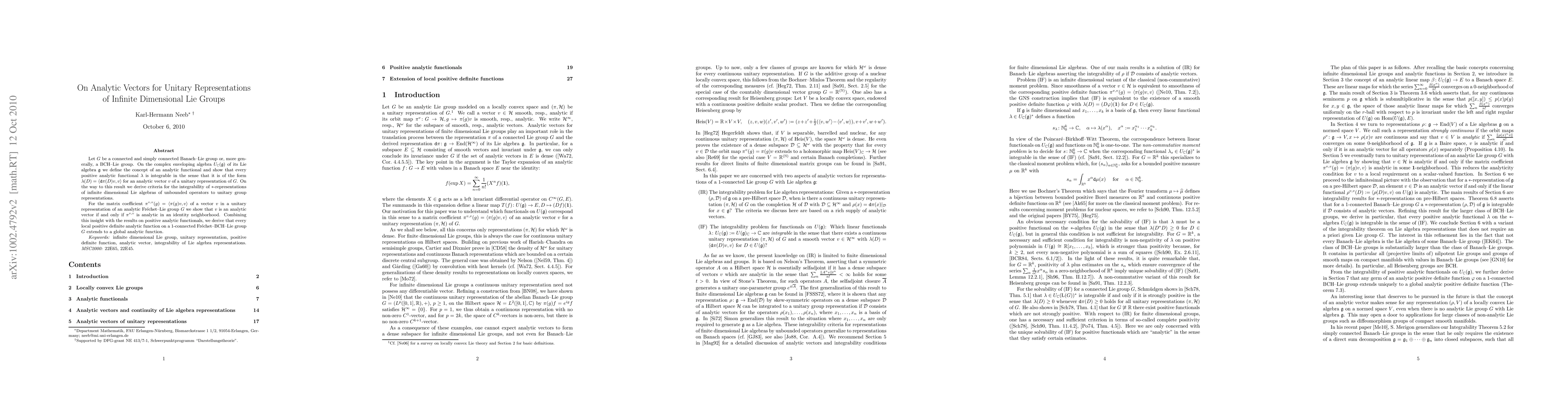 This paper defines analytic functionals on the complex enveloping algebra of a BCH-Lie group, demonstrating that every positive analytic functional is integrable via analytic vectors in unitary representations. It also establishes criteria for the analyticity of matrix coefficients, showing that a vector is analytic if its matrix coefficient is analytic near the identity.