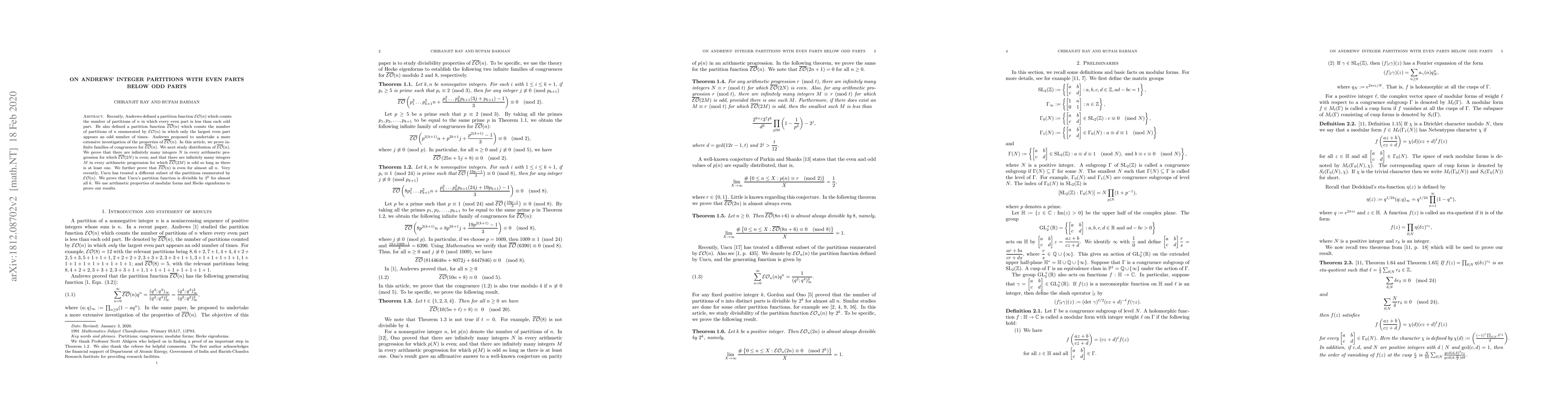Recently, Andrews defined a partition function $\mathcal{EO}(n)$ which counts the number of partitions of $n$ in which every even part is less than each odd part. He also defined a partition function $\overline{\mathcal{EO}}(n)$ which counts the number of partitions of $n$ enumerated by $\mathcal{EO}(n)$ in which only the largest even part appears an odd number of times. Andrews proposed to undertake a more extensive investigation of the properties of $\overline{\mathcal{EO}}(n)$. In this article, we prove infinite families of congruences for $\overline{\mathcal{EO}}(n)$. We next study parity properties of $\overline{\mathcal{EO}}(n)$. We prove that there are infinitely many integers $N$ in every arithmetic progression for which $\overline{\mathcal{EO}}(N)$ is even; and that there are infinitely many integers $M$ in every arithmetic progression for which $\overline{\mathcal{EO}}(M)$ is odd so long as there is at least one. Very recently, Uncu has treated a different subset of the partitions enumerated by $\mathcal{EO}(n)$. We prove that Uncu's partition function is divisible by $2^k$ for almost all $k$. We use arithmetic properties of modular forms and Hecke eigenforms to prove our results.