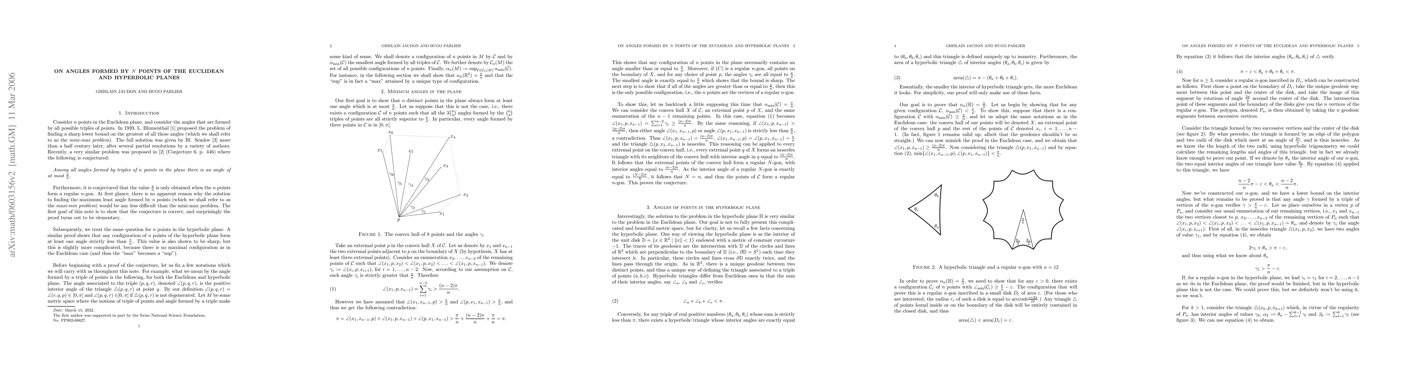 Researchers solved the problem of finding a sharp upper bound on the minimum angle formed by N points in Euclidean and Hyperbolic planes, establishing a clear relationship between point distribution and angle constraints.