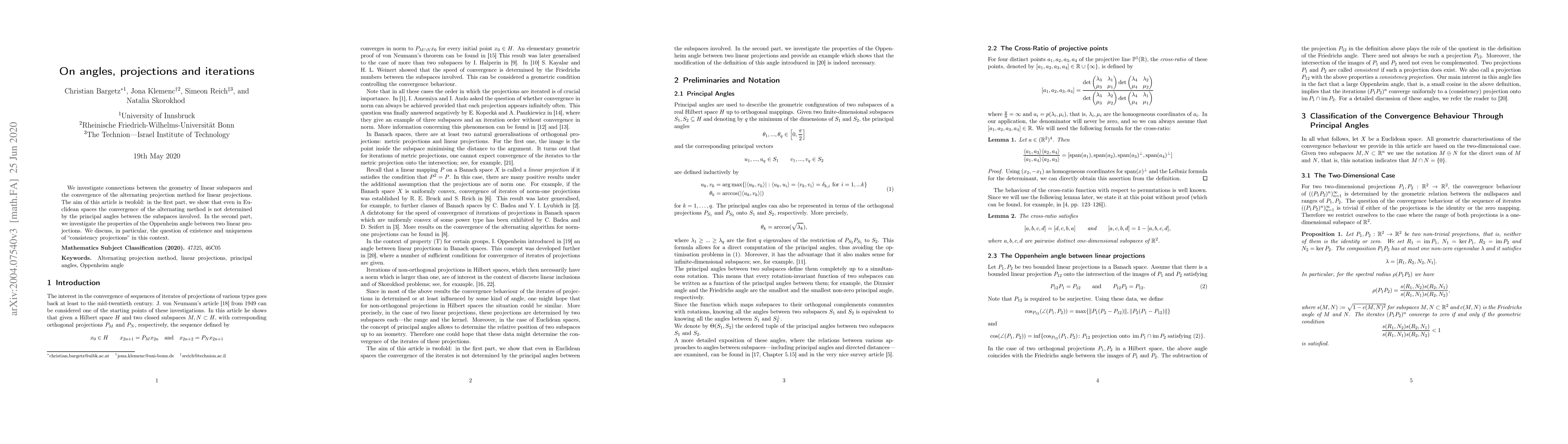 We investigate connections between the geometry of linear subspaces and the convergence of the alternating projection method for linear projections. The aim of this article is twofold: in the first part, we show that even in Euclidean spaces the convergence of the alternating method is not determined by the principal angles between the subspaces involved. In the second part, we investigate the properties of the Oppenheim angle between two linear projections. We discuss, in particular, the question of existence and uniqueness of "consistency projections" in this context.