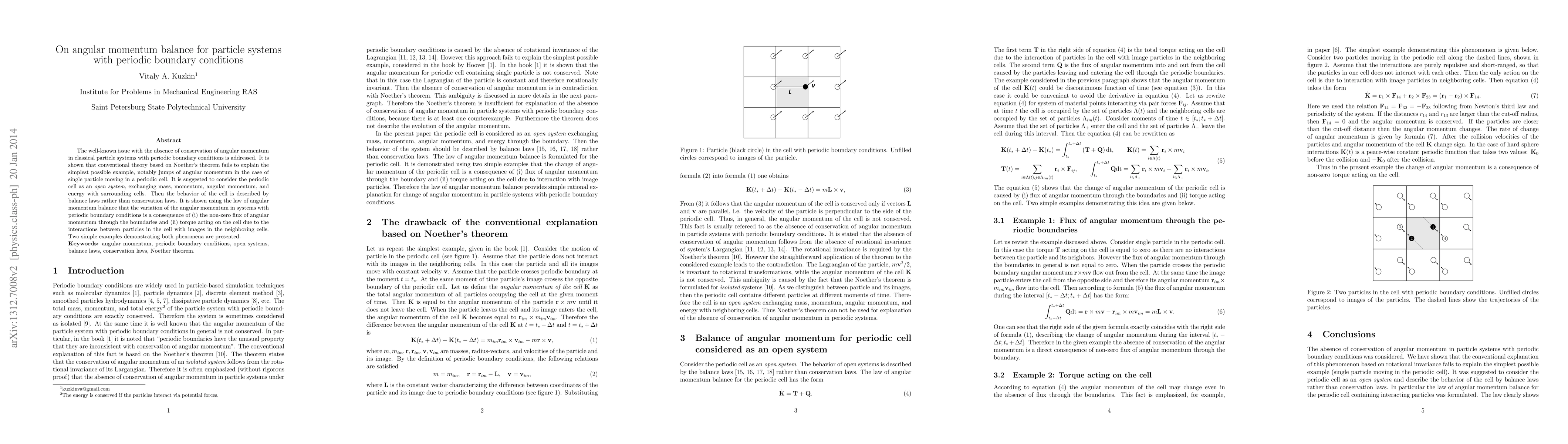 This paper addresses the issue of angular momentum conservation in particle systems with periodic boundary conditions, showing that conventional theory fails to account for observed angular momentum jumps. It proposes considering the periodic cell as an open system, where angular momentum balance explains variations due to angular momentum flux through boundaries and torque from particle interactions with neighboring cells.