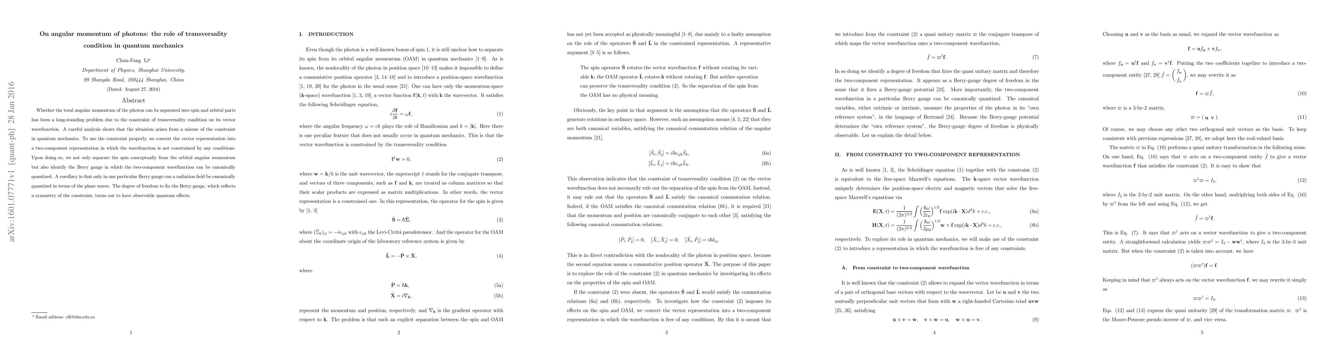 This paper resolves the longstanding issue regarding the separation of photon angular momentum into spin and orbital parts by correctly applying the transversality condition. It demonstrates that a two-component wavefunction representation, free from constraints, allows for clear separation and canonical quantization, revealing observable quantum effects tied to the choice of the Berry gauge.