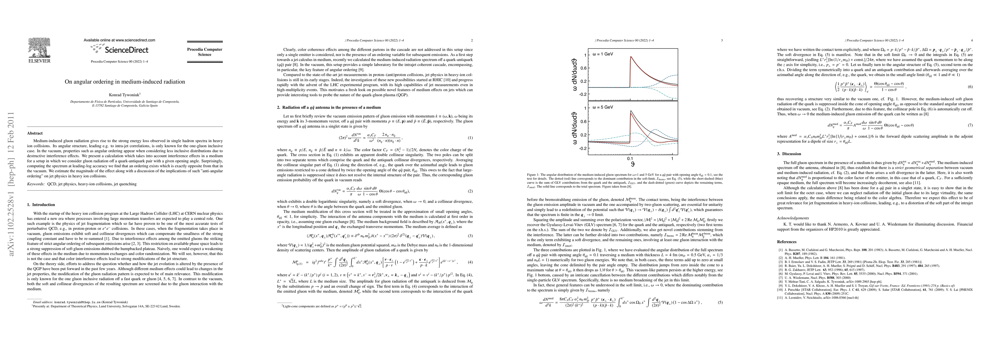 This paper investigates medium-induced gluon radiation in heavy-ion collisions, revealing that angular ordering effects, which are opposite to those in a vacuum, arise due to interference effects in the medium. The findings suggest significant implications for intra-jet correlations and energy-loss phenomena in such collisions.