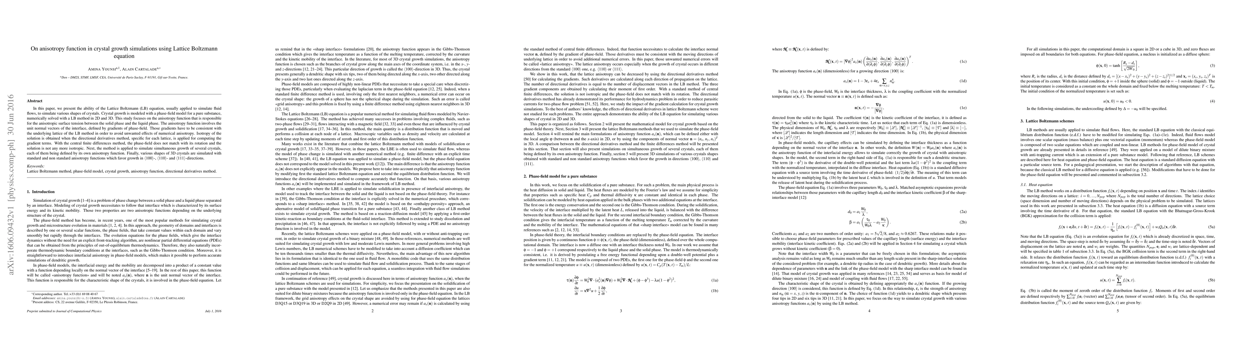 Researchers used the Lattice Boltzmann equation to simulate crystal growth in 2D and 3D, introducing an anisotropy function that affects surface tension, and successfully grew various crystal shapes with specific growth directions.