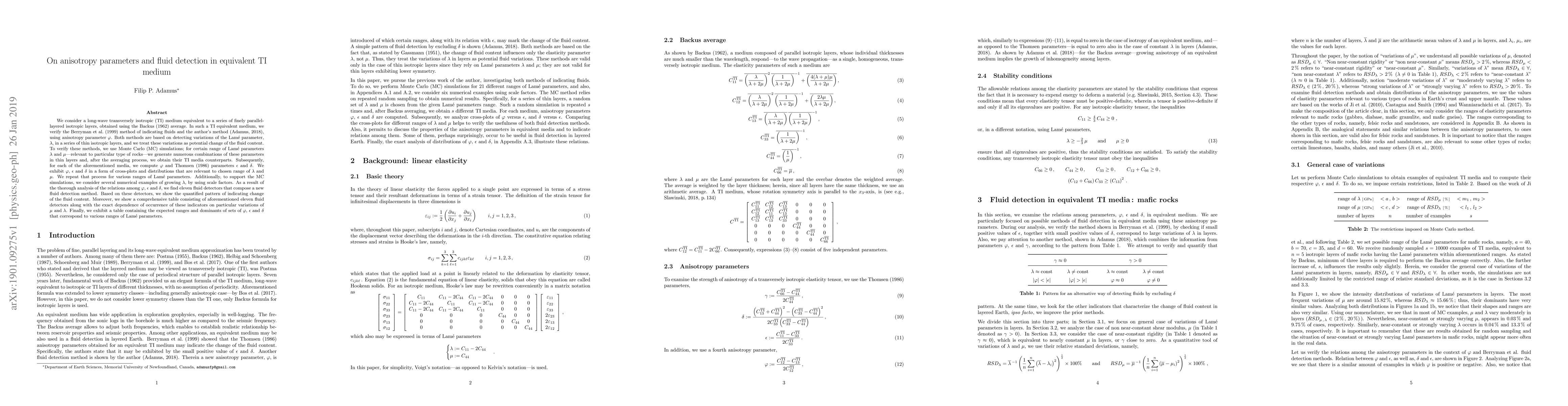 We consider a long-wave transversely isotropic (TI) medium equivalent to a series of finely parallel-layered isotropic layers, obtained using the \citet{Backus} average. In such a TI equivalent medium, we verify the \citet{Berrymanetal} method of indicating fluids and the author's method \citep{Adamus}, using anisotropy parameter $\varphi$. Both methods are based on detecting variations of the Lam\'e parameter, $\lambda$, in a series of thin isotropic layers, and we treat these variations as potential change of the fluid content. To verify these methods, we use Monte Carlo (MC) simulations; for certain range of Lam\'e parameters $\lambda$ and $\mu$---relevant to particular type of rocks---we generate numerous combinations of these parameters in thin layers and, after the averaging process, we obtain their TI media counterparts. Subsequently, for each of the aforementioned media, we compute $\varphi$ and \citet{Thomsen} parameters $\epsilon$ and $\delta$. We exhibit $\varphi$, $\epsilon$ and $\delta$ in a form of cross-plots and distributions that are relevant to chosen range of $\lambda$ and $\mu$. We repeat that process for various ranges of Lam\'e parameters. Additionally, to support the MC simulations, we consider several numerical examples of growing $\lambda$, by using scale factors. As a result of the thorough analysis of the relations among $\varphi$, $\epsilon$ and $\delta$, we find eleven fluid detectors that compose a new fluid detection method. Based on these detectors, we show the quantified pattern of indicating change of the fluid content.