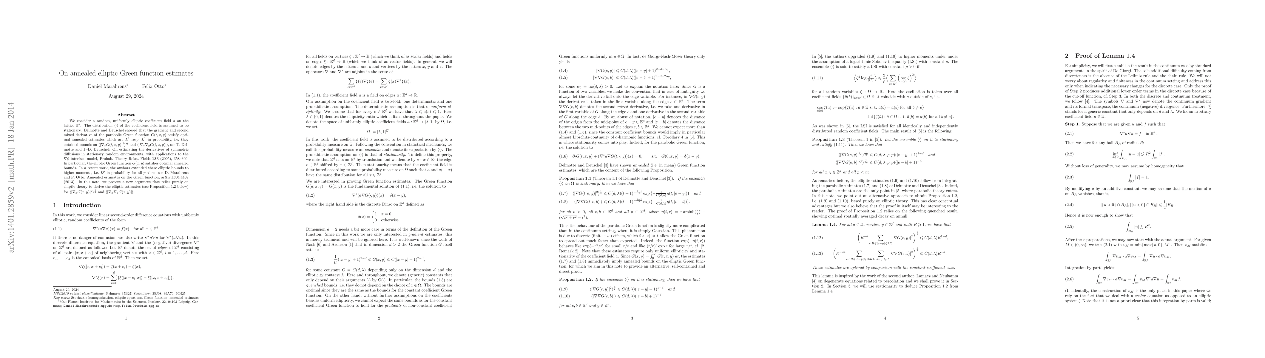 We consider a random, uniformly elliptic coefficient field $a$ on the lattice $\mathbb{Z}^d$. The distribution $\langle \cdot \rangle$ of the coefficient field is assumed to be stationary. Delmotte and Deuschel showed that the gradient and second mixed derivative of the parabolic Green function $G(t,x,y)$ satisfy optimal annealed estimates which are $L^2$ resp. $L^1$ in probability, i.e. they obtained bounds on $\langle |\nabla_x G(t,x,y)|^2 \rangle^{\frac{1}{2}}$ and $\langle |\nabla_x \nabla_y G(t,x,y)| \rangle$, see T. Delmotte and J.-D. Deuschel: On estimating the derivatives of symmetric diffusions in stationary random environments, with applications to the $\nabla\phi$ interface model, Probab. Theory Relat. Fields 133 (2005), 358--390. In particular, the elliptic Green function $G(x,y)$ satisfies optimal annealed bounds. In a recent work, the authors extended these elliptic bounds to higher moments, i.e. $L^p$ in probability for all $p<\infty$, see D. Marahrens and F. Otto: {Annealed estimates on the Green function}, arXiv:1304.4408 (2013). In this note, we present a new argument that relies purely on elliptic theory to derive the elliptic estimates (see Proposition 1.2 below) for $\langle |\nabla_x G(x,y)|^2 \rangle^{\frac{1}{2}}$ and $\langle |\nabla_x \nabla_y G(x,y)| \rangle$.