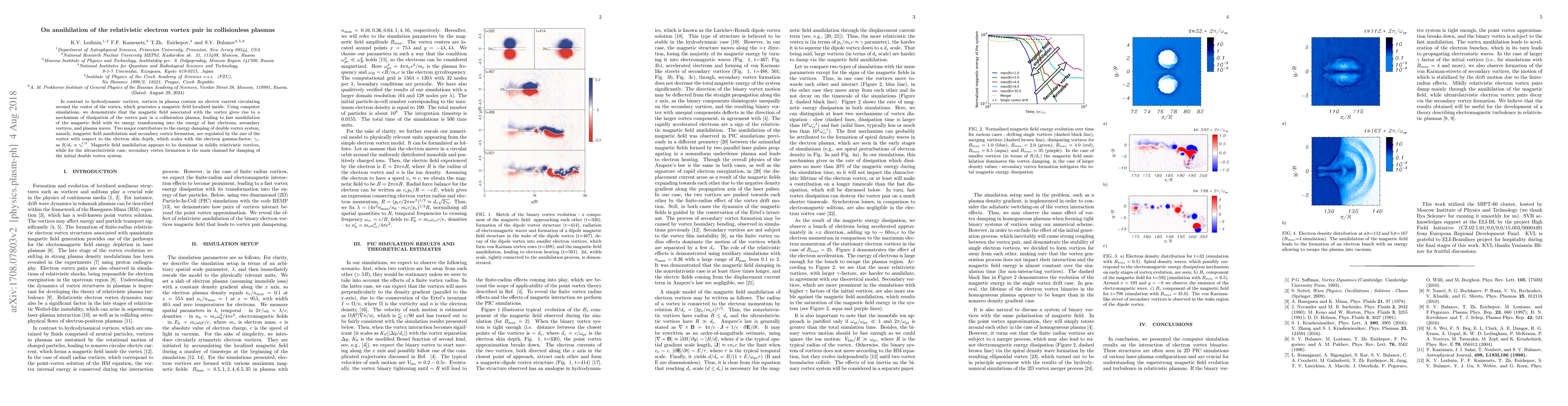 Researchers used computer simulations to show that magnetic fields in vortex pairs in plasma lead to their fast annihilation, with energy transforming into fast electrons, secondary vortices, and plasma waves.