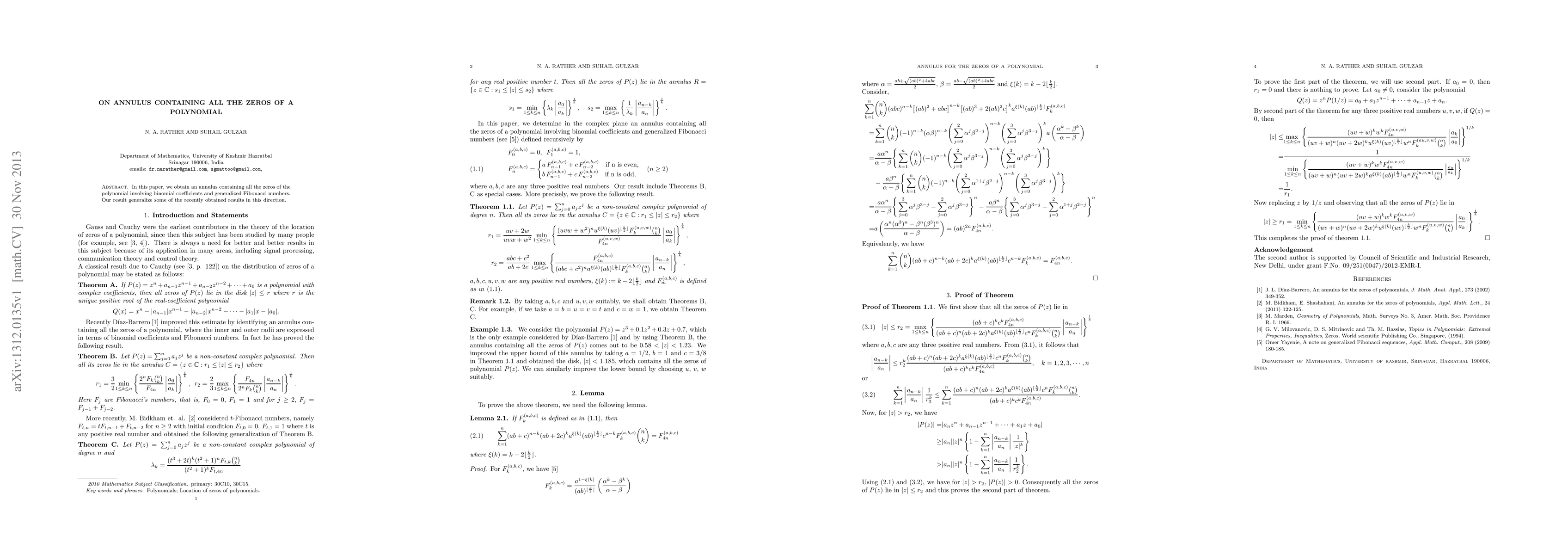 Researchers found an annulus that contains all the zeros of a polynomial involving binomial coefficients and generalized Fibonacci numbers, generalizing recent results in this field.