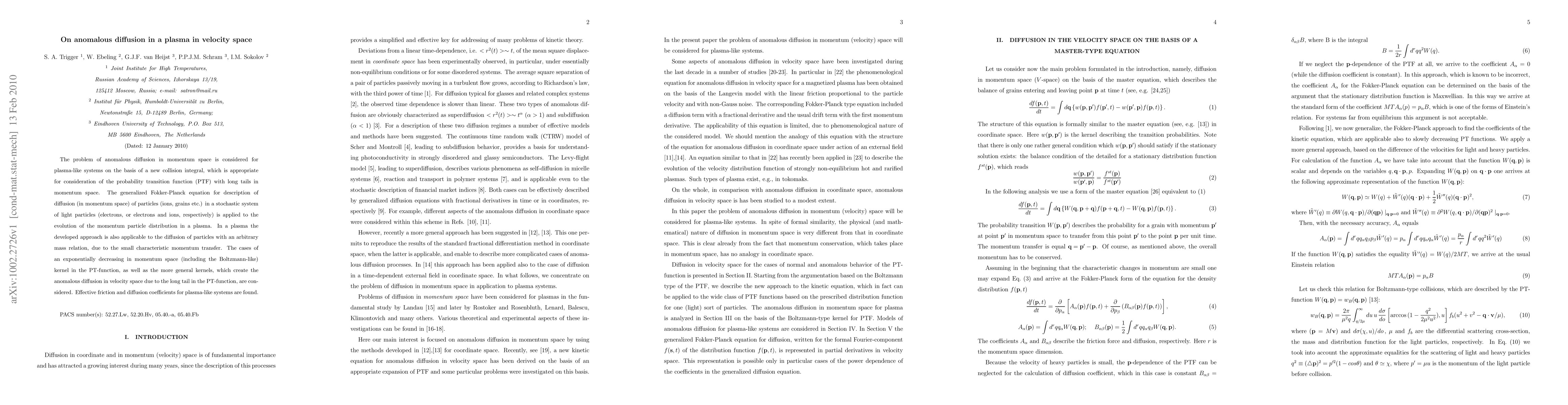 A new kinetic equation for anomalous diffusion in velocity space was derived using a combination of theoretical and numerical methods.